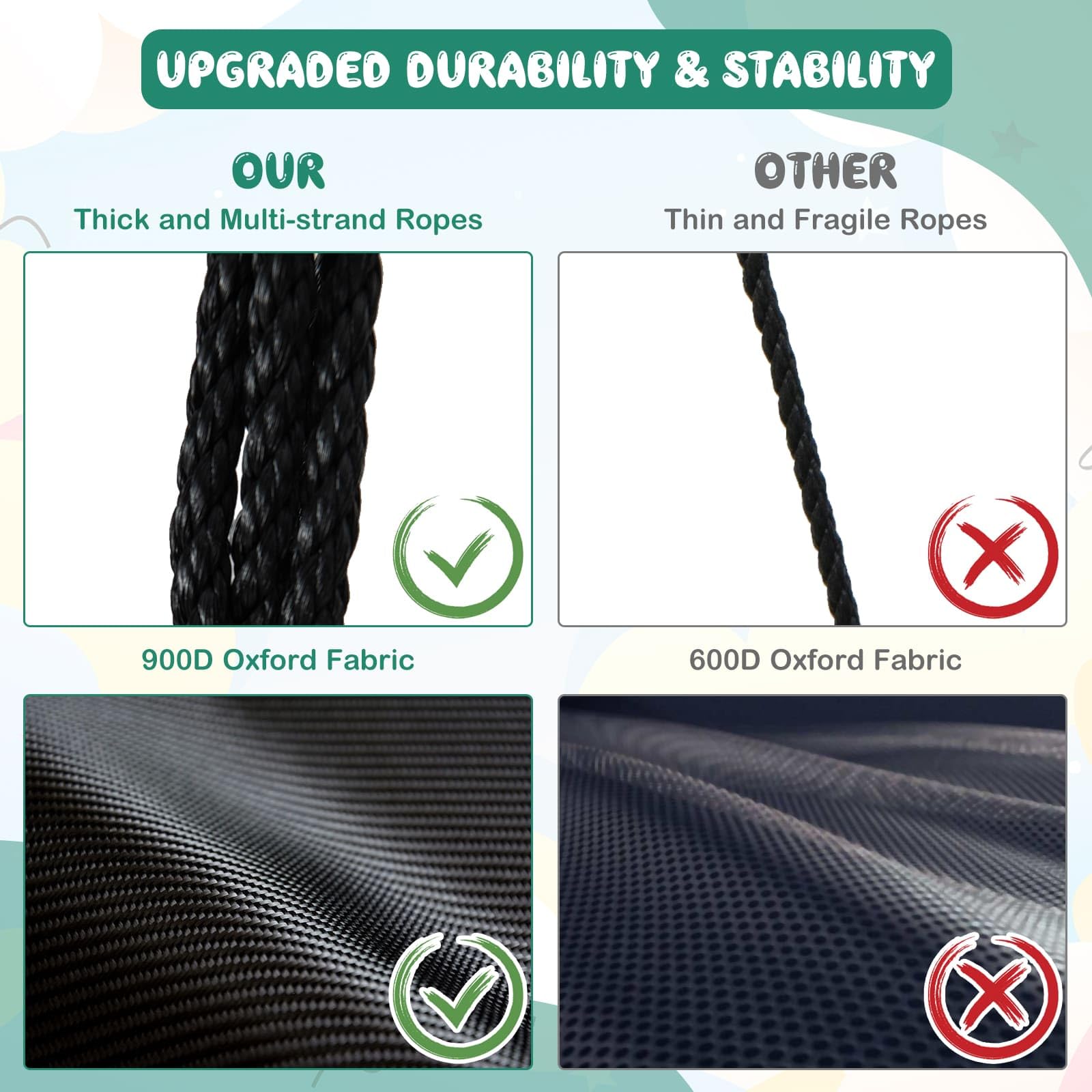 Compared with other swings with thin and fragile ropes, the swing seat with thick and multi-strand ropes is safer. Similarly, the 900D oxford fabric features upgraded durability and stability than 600D oxford fabric. The large seat permits 2 kids to enjoy their wonderful leisure time at the same time. Moreover, you can hang the tree swing with 1 point or 2 points for varying fun. And the ropes can be adjusted from 118 cm to 173 cm based on various needs. More importantly, the clear user's manual and complete accessories make assembly a breeze. You can use it various occasions, such as backyard, living room, kindergarten, etc.