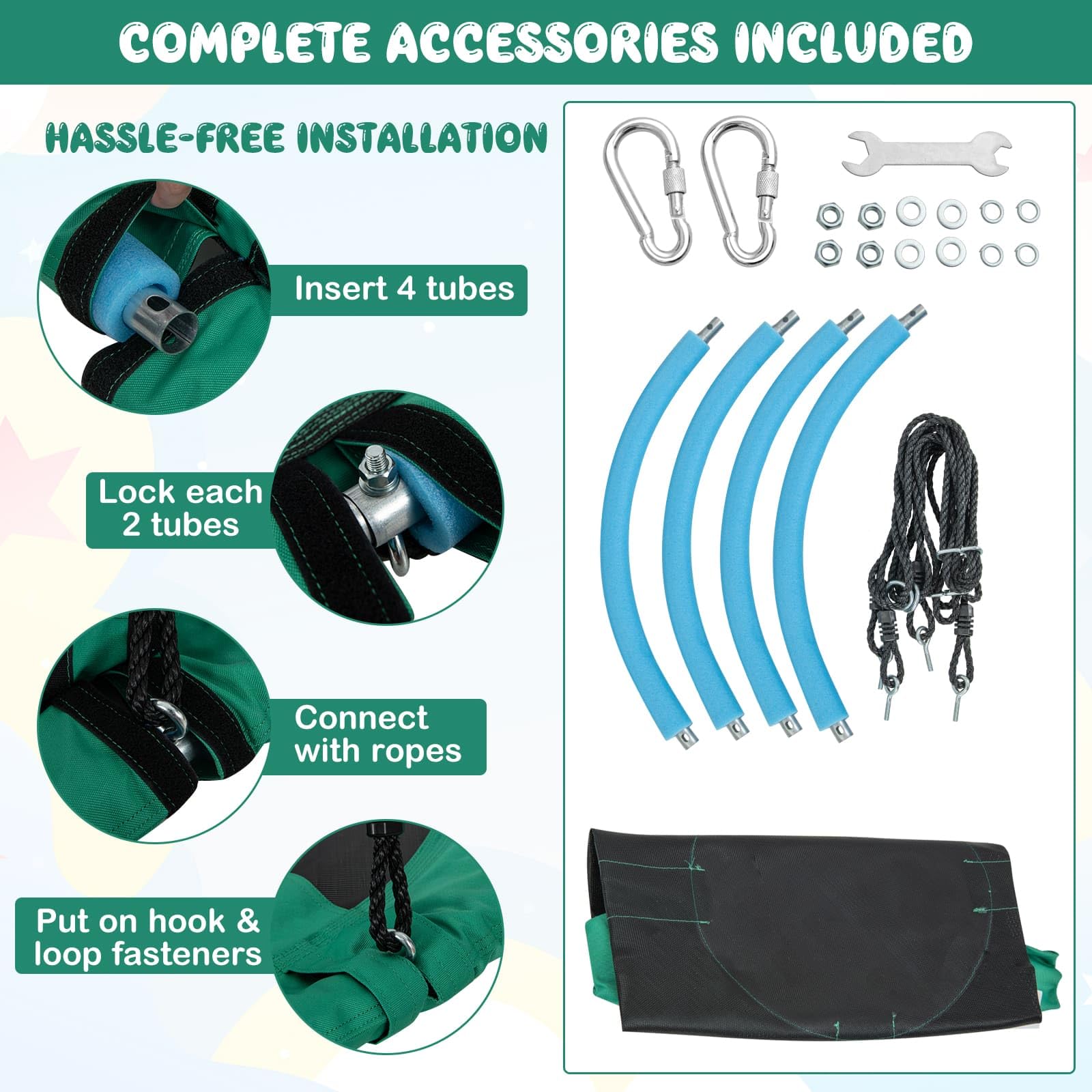 Hassle-free Installation: With detailed instruction and complete accessories included, the flying swing seat can be easily installed. You can do the following steps to finish installation: ① Insert 4 tubes. ② Lock each 2 tubes. ③ Connect with ropes. ④ Put on hook and loop fasteners.