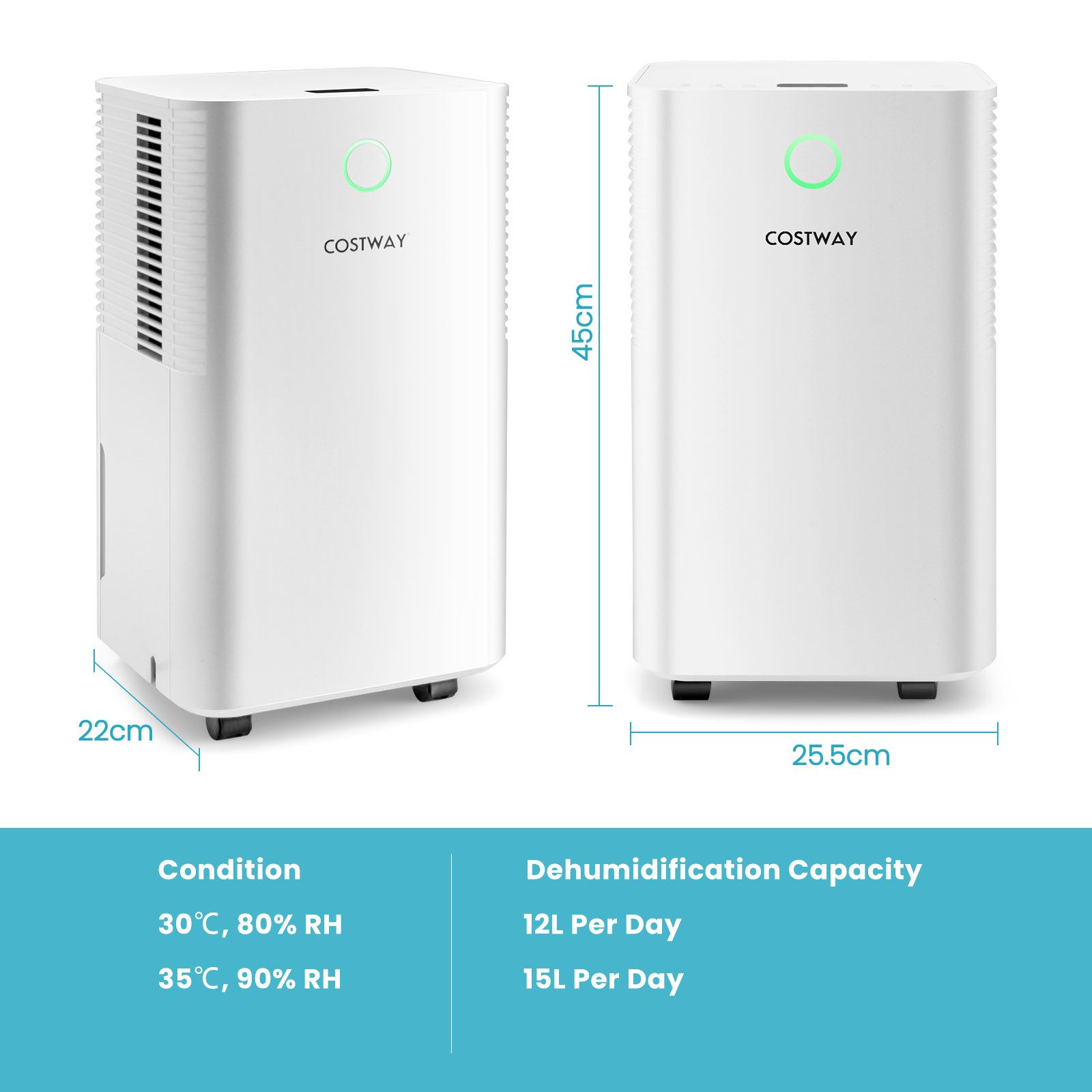 High Efficiency Dehumidification: This dehumidifier can remove 2L of water in the air per day under 35℃, 90% RH condition (12L under 30℃, 80% RH condition). Besides, it can adjust humidity from 30% to 80% and is ideal for rooms up to 10-15㎡., like the bathroom, basement, cellar, garage and bedroom.