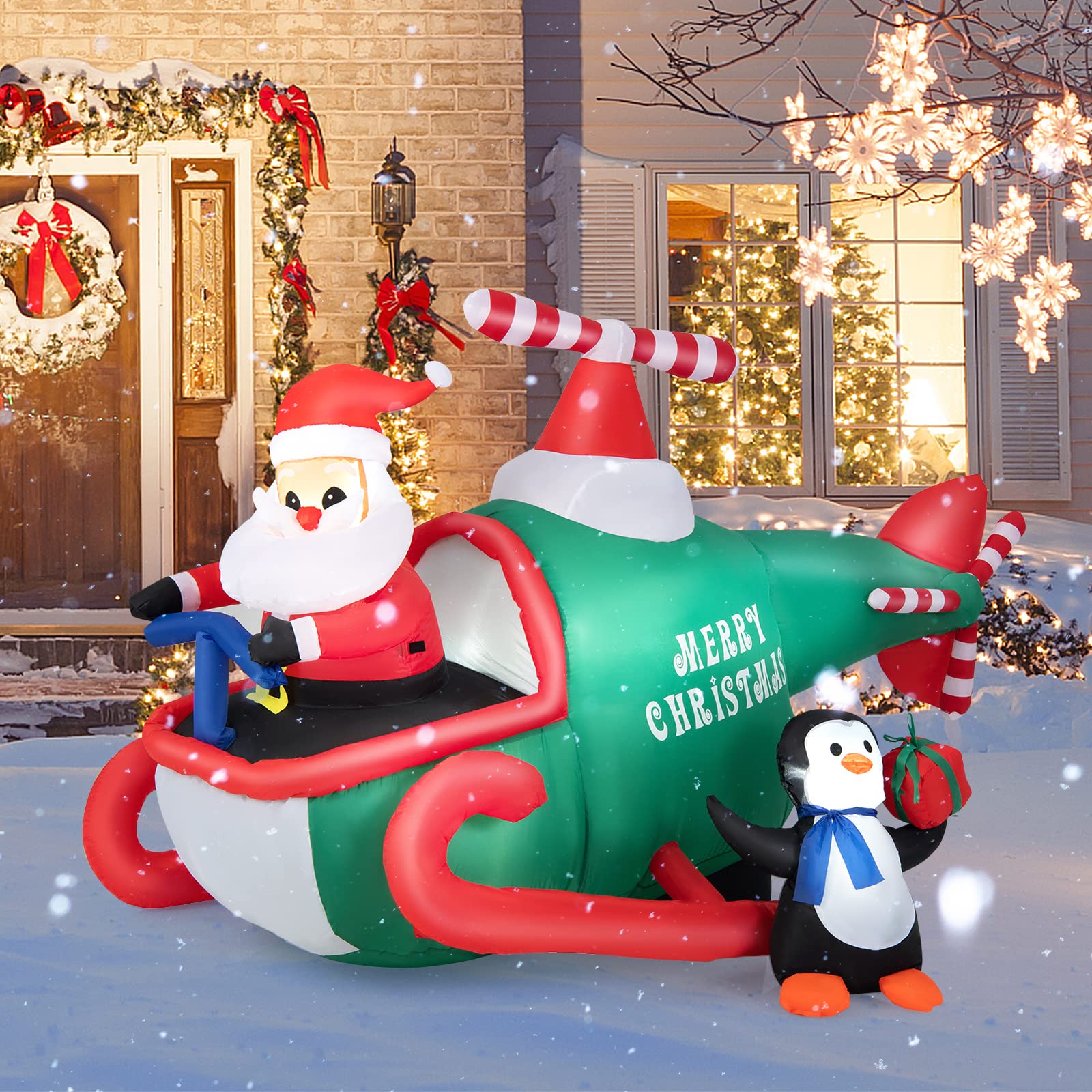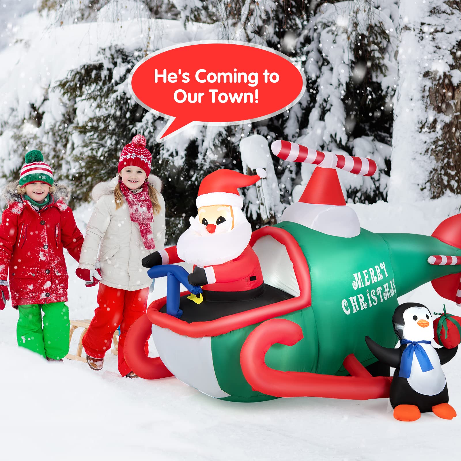 Attractive Christmas Decoration: Santa Claus smiles benignly, driving the helicopter with a little cute penguin. Now they are coming to your town! The special appearance makes the inflatable decoration the highlight of your backyard, which will surely be loved by little kids!
