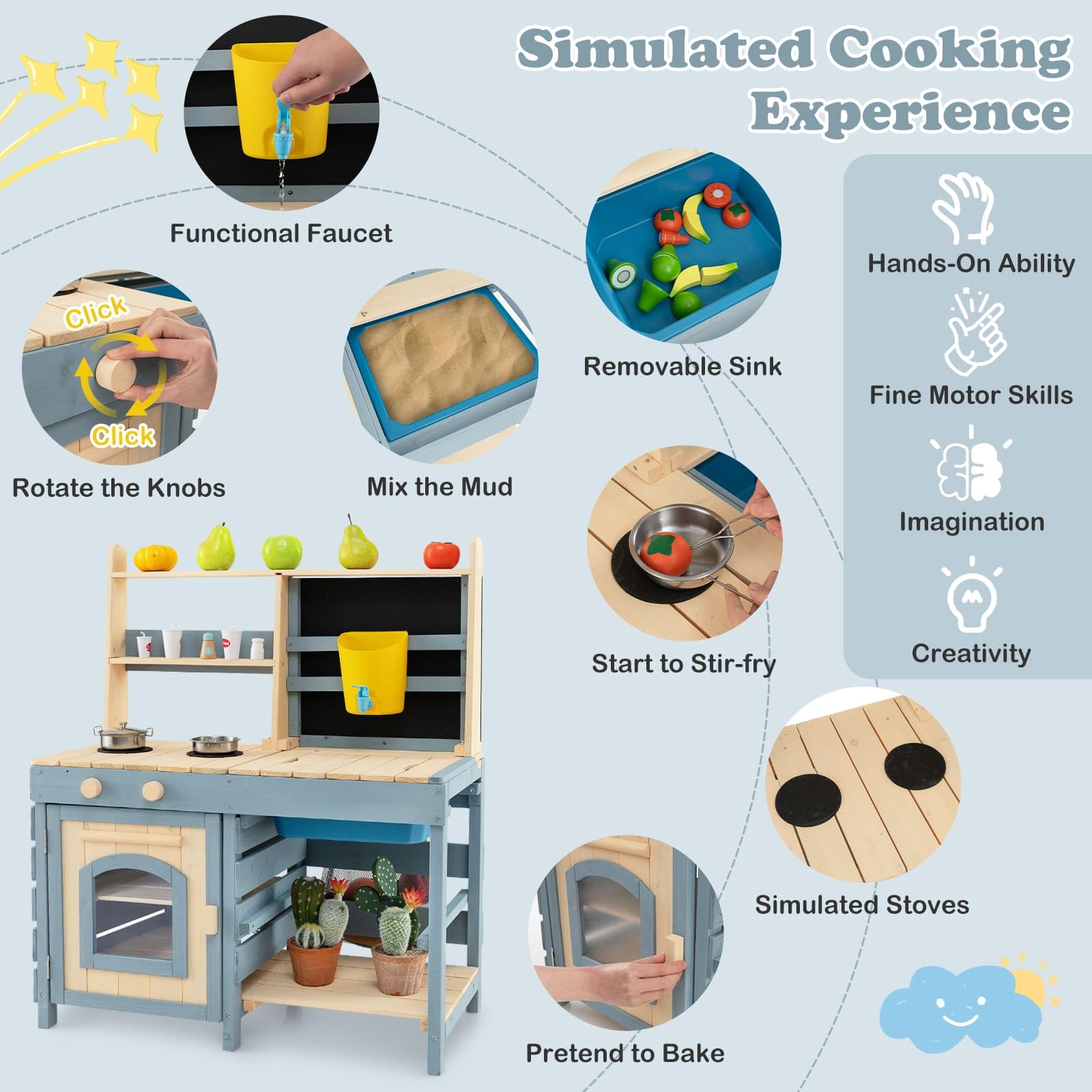 Mud Kitchen and Grocery Store: The front side is a mud kitchen with 2 simulated stoves, functional faucet, removable sink, and realistic oven for immersive cooking game. Besides, the back side is a grocery store for imaginative selling and shopping experience. Kids can write menu on the large chalkboard.