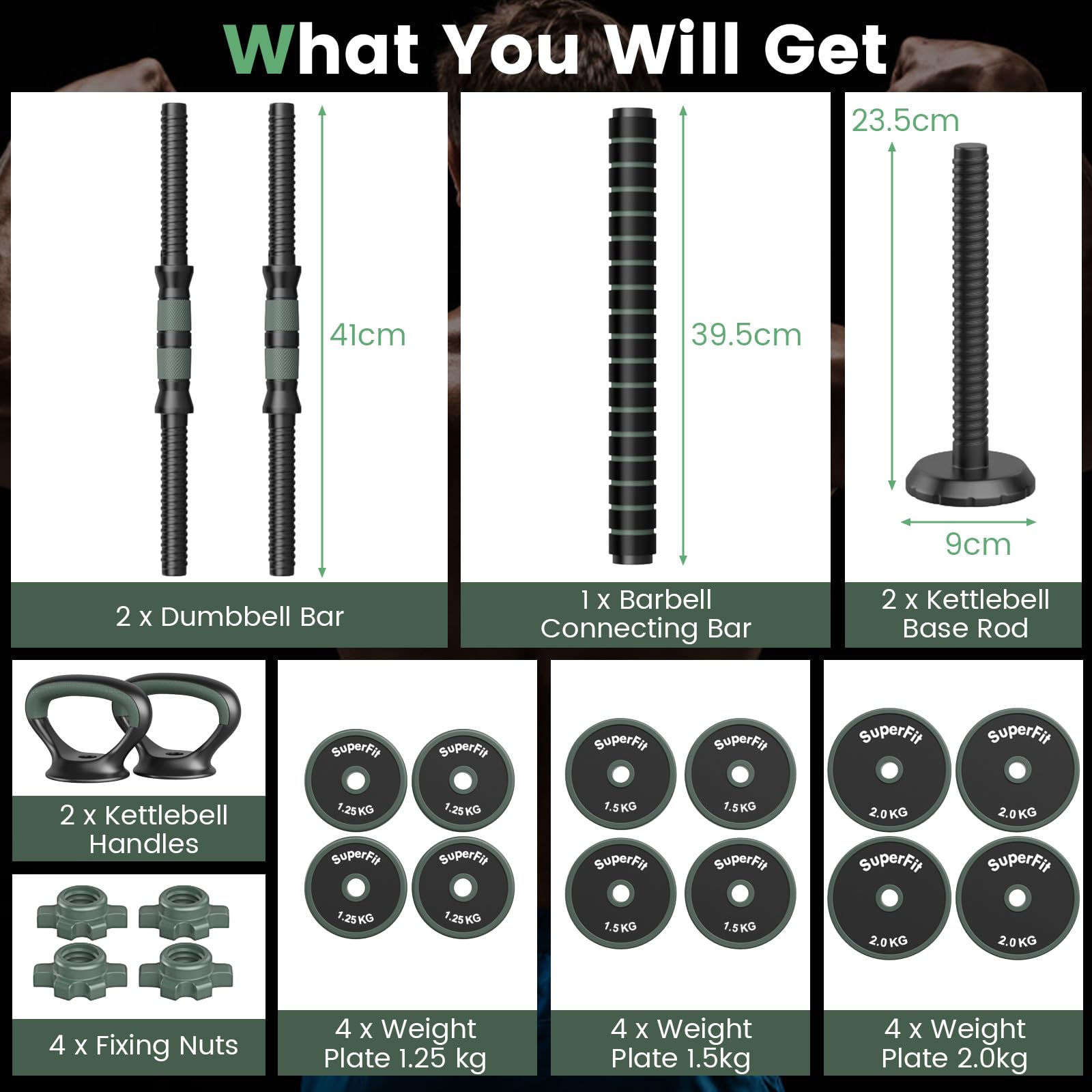 What You Will Get: The whole set includes 1 barbell connecting bar, 2 dumbbell bars, 1 kettlebell handle, 2 kettlebell base rod, 4 spin lock collars and more weight options with 12 weight plates, including 1.25kg x 4, 1.5kg x 4 and 2kg x 4.