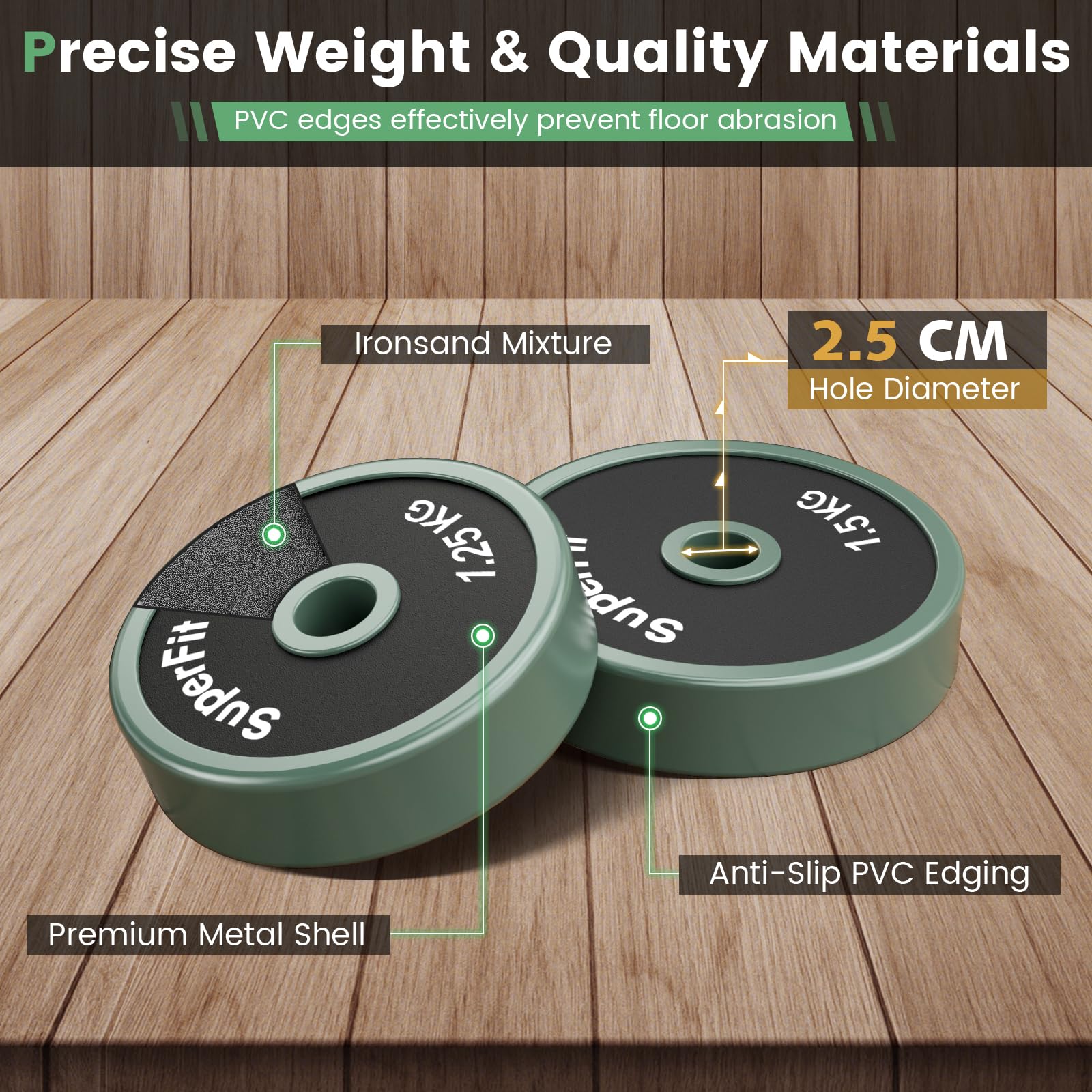 Precise Weight and Quality Materials: The weight plates are made of ironsand mixture, premium metal shell and anti-slip PVC edging. In addition, PVC edges add cushioning and effectively prevent floor abrasion. Hole diameter: 2.5 cm.