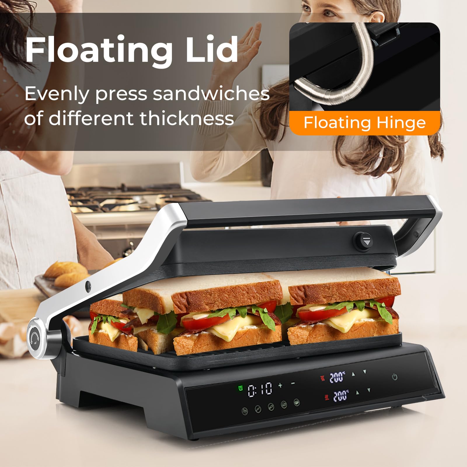 Fast Heating & Floating Lid: Equipped with a high-quality stainless steel heating tube, this 2000W electric panini press grill can heat up quickly. Besides, with the help of the floating hinge, the top lid can be flipped to evenly press sandwiches of different thickness (10-50mm).