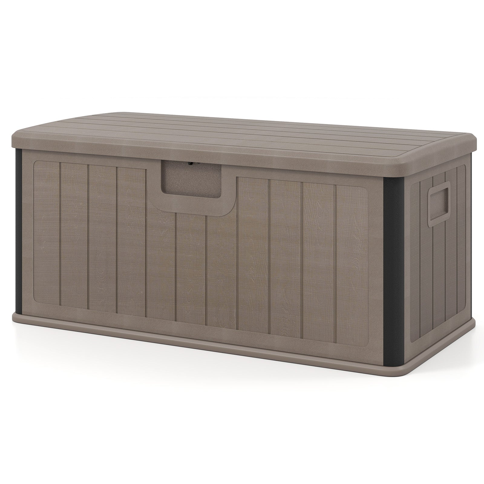 The premium deck box is crafted from weatherproof HDPE material for long-lasting use. Its large capacity is ideal for your pool supplies, pillows, tools, ensuring a clutter-free space. The openable lid with gas strut and lockable design will ensure your items are kept safe and protected. Additionally, the versatile deck box can effortlessly transform into a side table, or serve as additional seating according to your needs. Designed with cut-out handles, the storage container can be easily moved around your outdoor oasis. The simulated wood grain finish adds a touch of sophistication, enhancing the overall appeal of your outdoor setting. Whether you're hosting a gathering or simply enjoying some relaxation time outdoors, this deck box is the perfect addition.