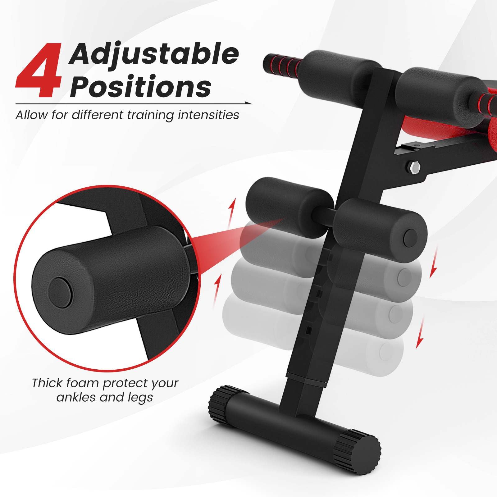 Foldable for easy storage, suitable for limited spaceEquipped with thick foam on crunch handles to protect your ankles and legsComfortable with 4 cm soft foam paddingMade with skin-friendly, wear-resistant and sweat-proof PU leatherDesigned with 4 adjustable positions for different workout intensitiesBuilt with a heavy-duty metal framePrevents movement during workout with non-slip foot padsSuitable for various exercises, including ab strength training