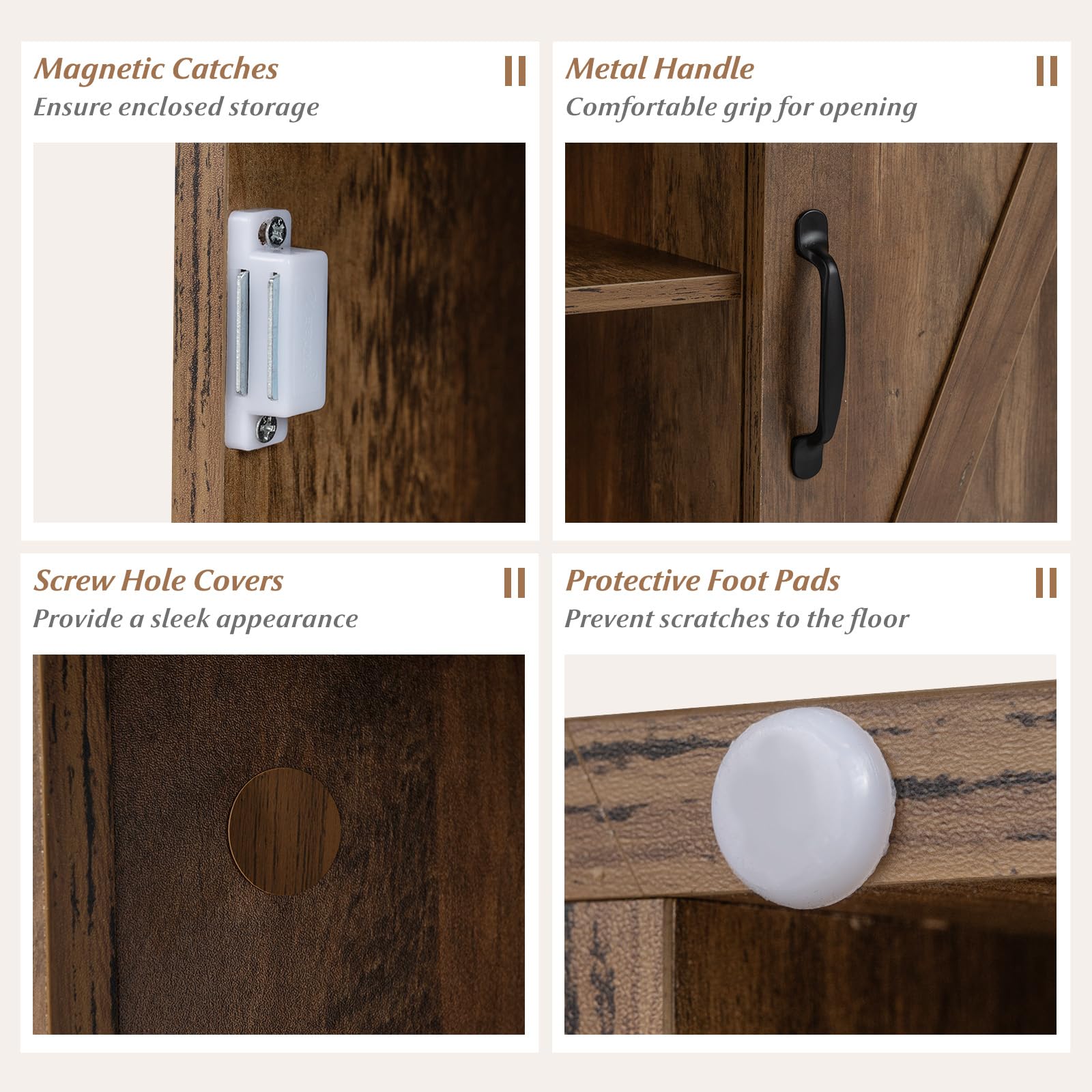 This bedside cabinet marries rustic farmhouse style with modern convenience, featuring 2 AC outlets, USB, and type-C ports for seamless device charging. Its extended power cord allows flexible placement, keeping your space clutter-free. Designed for ample storage, it boasts a spacious top surface perfect for a lamp, open shelves ideal for books, and a concealed cabinet with an adjustable 3-level shelf to neatly organize drinks, snacks, and a phone. You can customize the height of each level according to your specific needs, ensuring optimal organization. Crafted from sturdy, high-quality boards, the night stand ensures lasting stability and includes protective foot pads to prevent floor damage. The charming barn door facade, complemented by matching screw hole covers, lends a warm, timeless look that enhances any room's decorations.