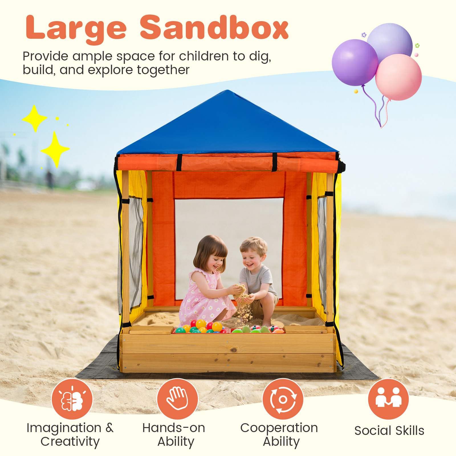Kids Wooden Sandbox with Canopy, Outdoor Large Fir Wood Playhouse w/Bottom Liner