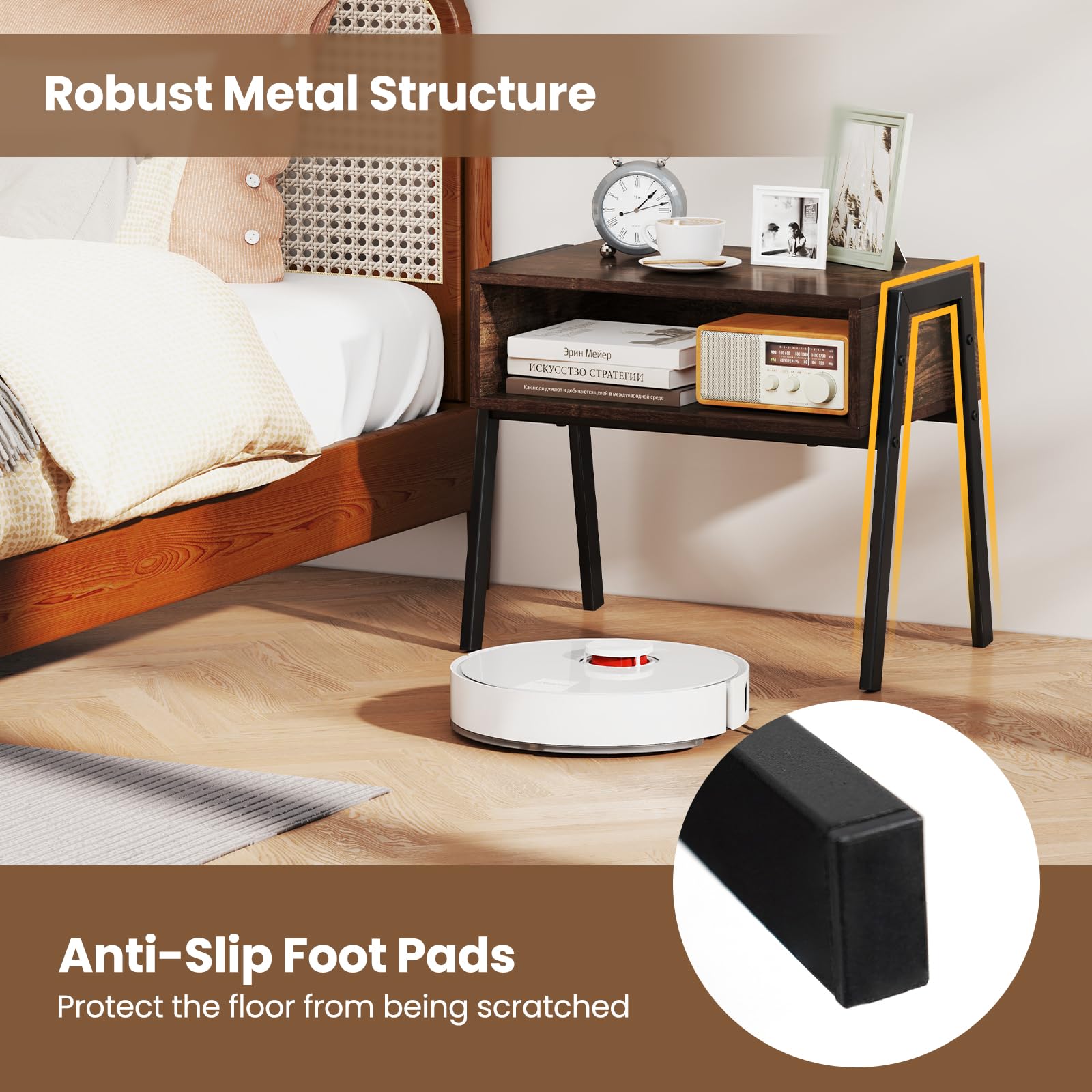 Create a chic and versatile space with this set of 2 nightstands. Stack them for convenience or place them side by side for extra storage and workspace. The side tables feature open compartments for easy access, sturdy metal legs with a load capacity of 45 kg each, and anti-slip foot pads to protect your floors. Each end table will work as a perfect display spot for your photo frames, potted plants, decorations, etc. Their innovative design allows for individual or combined use in various settings, such as living rooms, bedrooms, and studies.