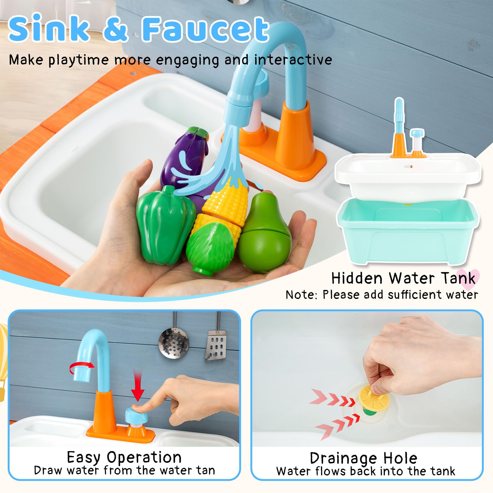 The kitchen playset is well-crafted with sturdy wooden construction, ensuring durability and safety during playtime. The combination of stoves, rotatable knobs, cutting board and chalkboard adds a fun and creative element to the playset, sparking imaginative and role-playing activities. Further enhancing the realism, this kitchen playset boasts circulation faucet system for extra fun. The cooking accessories further enhance the play experience, allowing kids to engage in pretend cooking and nurturing their creativity. Multiple shelves and hanging hooks help kids learn about organizing and tidying up after they finish cooking.
