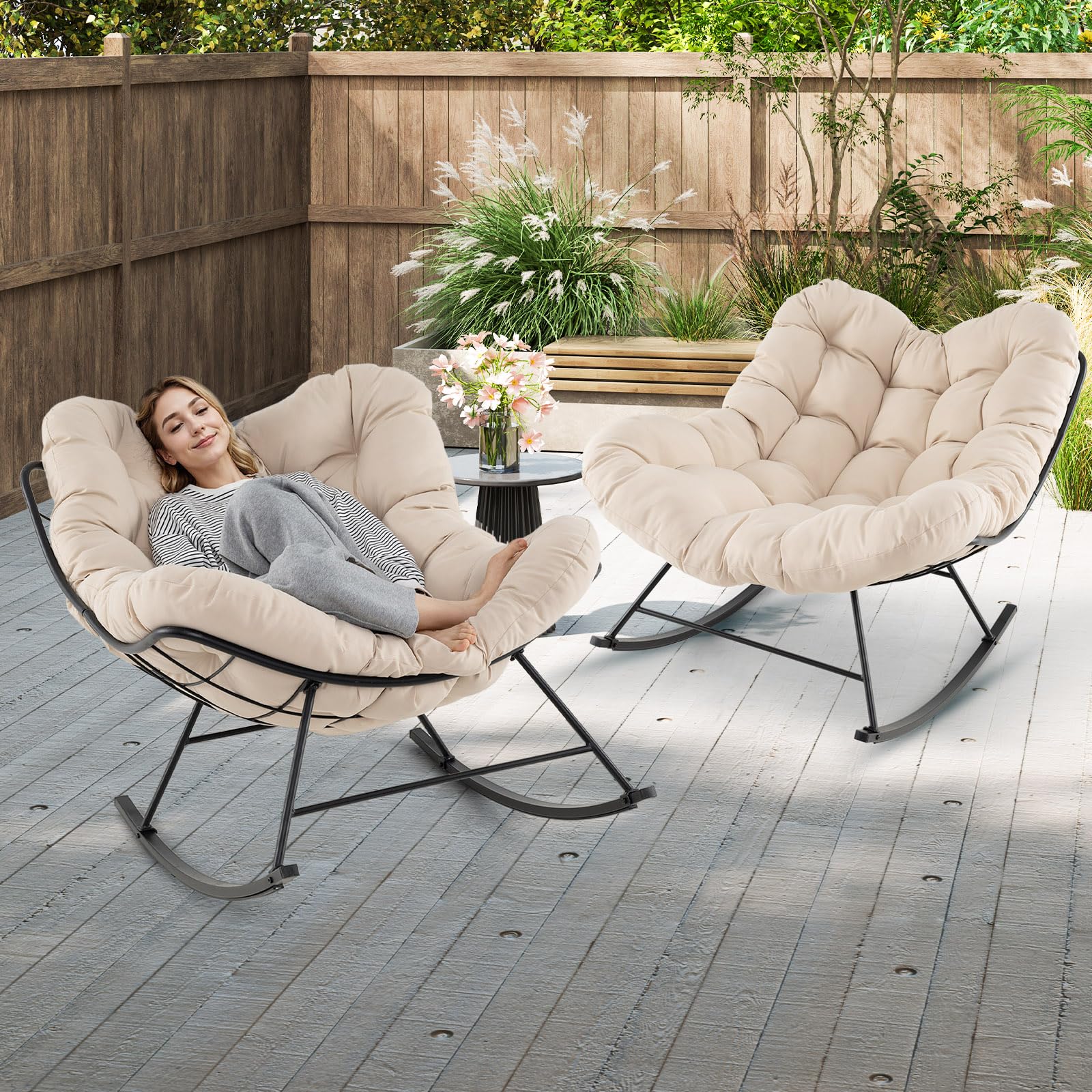Boasting a reinforced metal frame, the rocking chair is engineered to support up to 205 kg without compromising on style or comfort. The 13 cm thick cloud-like cushion invites you to bid adieu to fatigue and embrace pure relaxation. With our chair's smooth rocking motion, you can immerse in a good book or simply enjoy the beauty of your surroundings. The oversized rocker chair boasts adjustable foot pads and stability enhancements, ensuring a worry-free experience every time you take a seat. Also, the non-slip pads avoid damage to the floor, making it suitable for indoor and outdoor use.