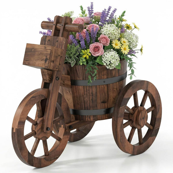 Wood Tricycle Flower Cart Planter with Drainage Hole and Storage Box