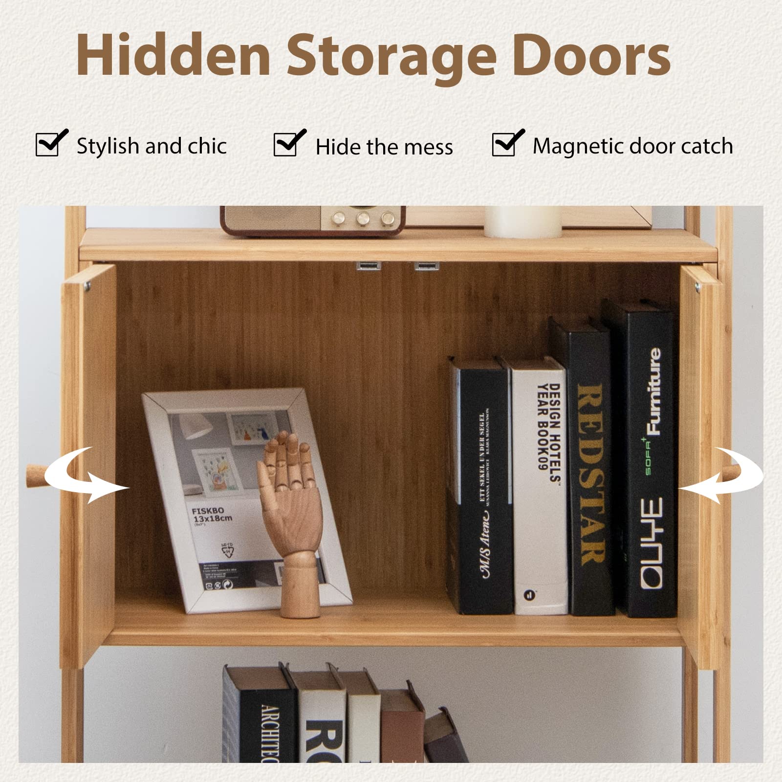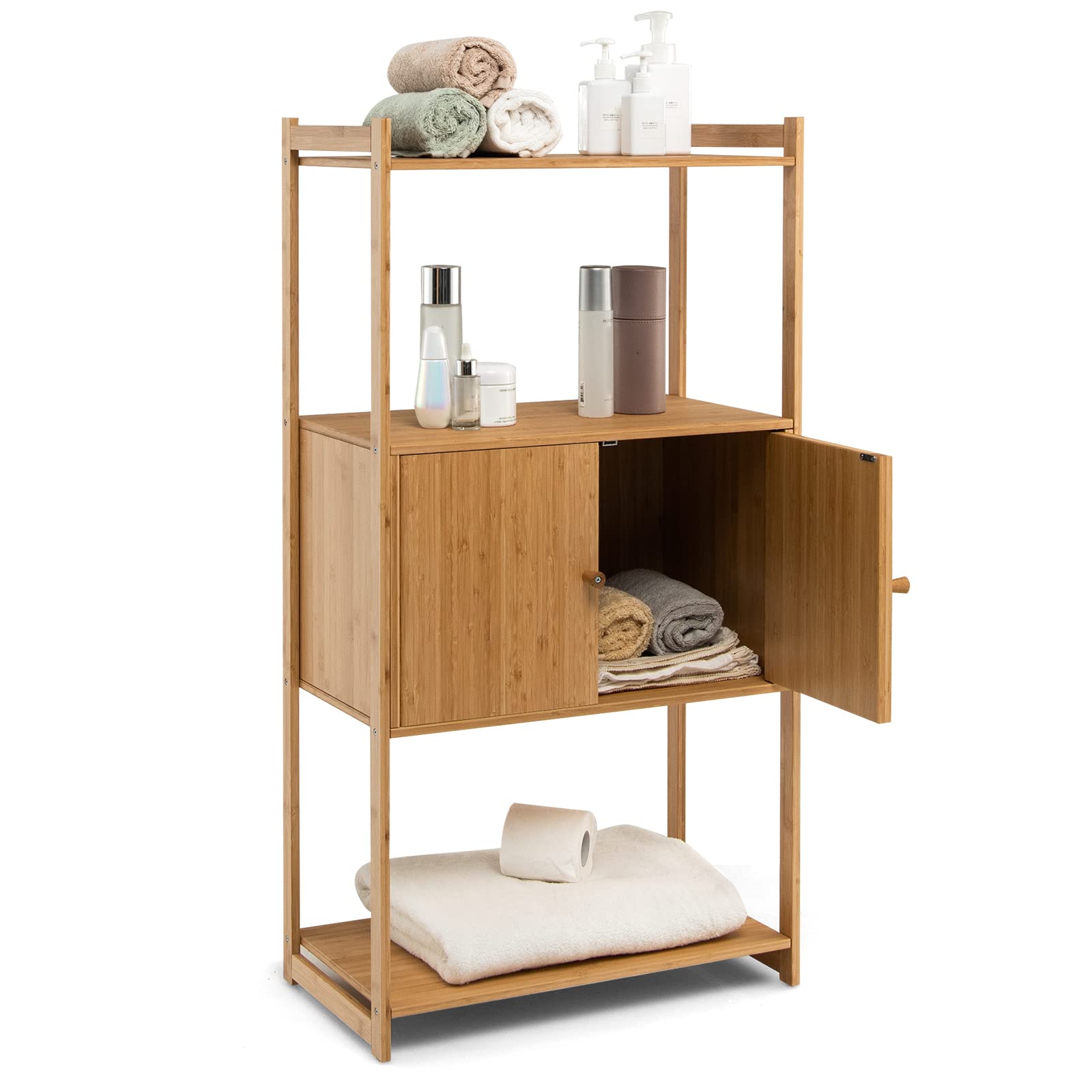 This bamboo bathroom floor cabinet features 4-tier vertical storage-- use the open tall shelves to store or display books, photos, plants, towering decorations and hide the mess with the cabinet. The magnetic door catch prevents the doors being slammed to extend the service life. Designed to fit multiple purposes, this display shelf works as a bookcase, plant stand, kitchen rack and so much more. Made of bamboo, it satisfies the style and meets your standard of quality. The natural outlook is suitable for diverse occasions, office, bathroom, living room, bedroom, kitchen and more. And you can reposition the cabinet among 3 layers for your preference!