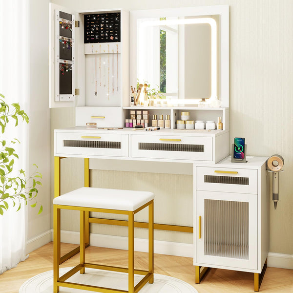 Makeup Vanity Desk with Mirror and Lights, Dressing Table and Stool Set with Charging Station