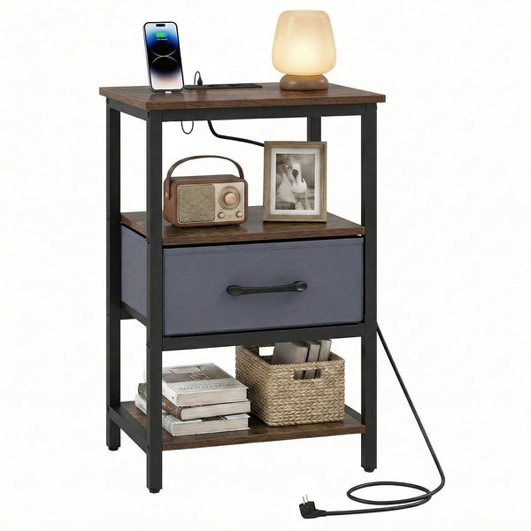 Nightstand with Charging Station Bedside Table with Fabric Drawer