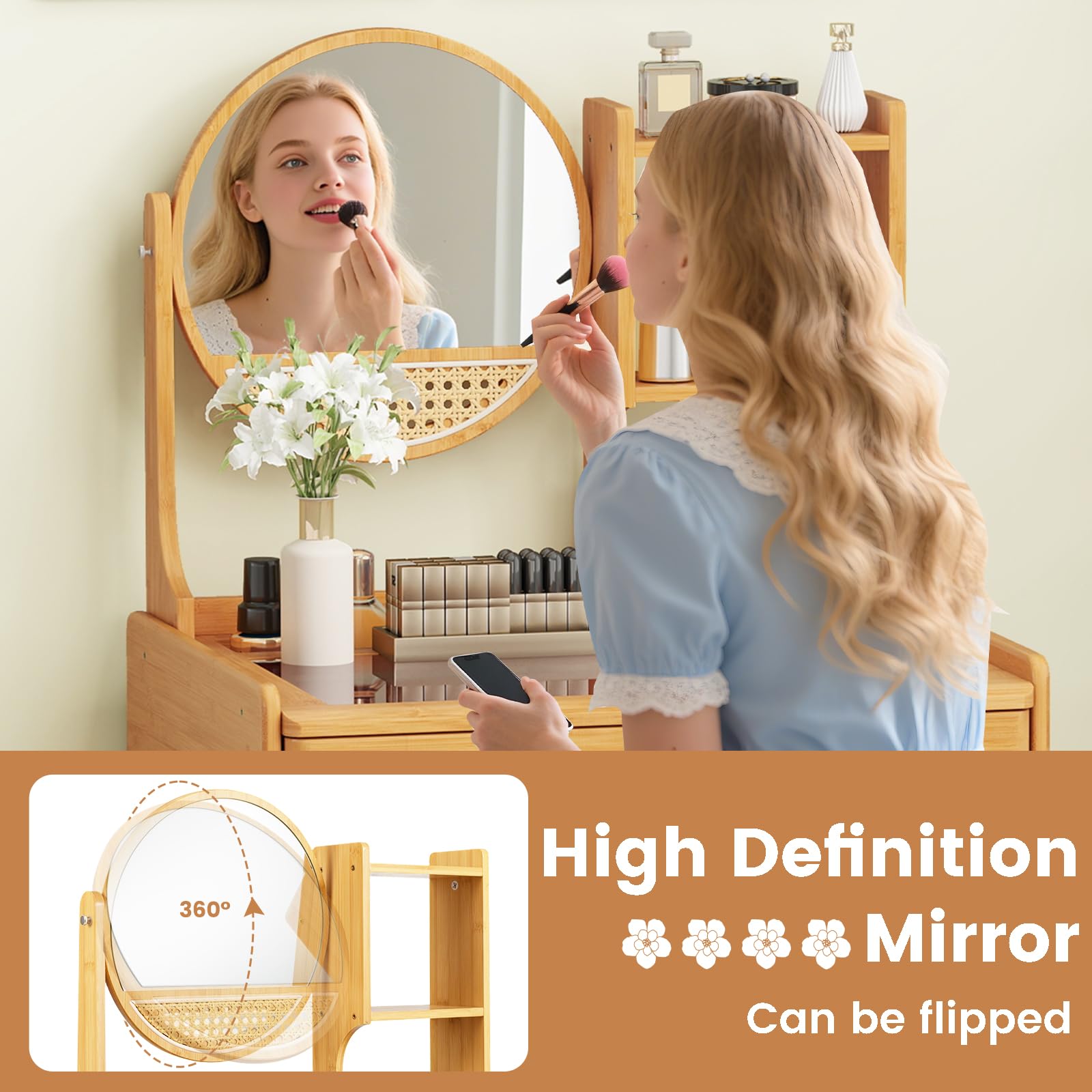 Featuring ample storage options, including open shelves, drawers, and a tall bottle organizer, this vanity desk combines elegance with practicality. The rotatable mirror and glass tabletop add to its functionality and style. Perfect for small spaces, the compact size and anti-toppling device ensure safety and versatility in any room.