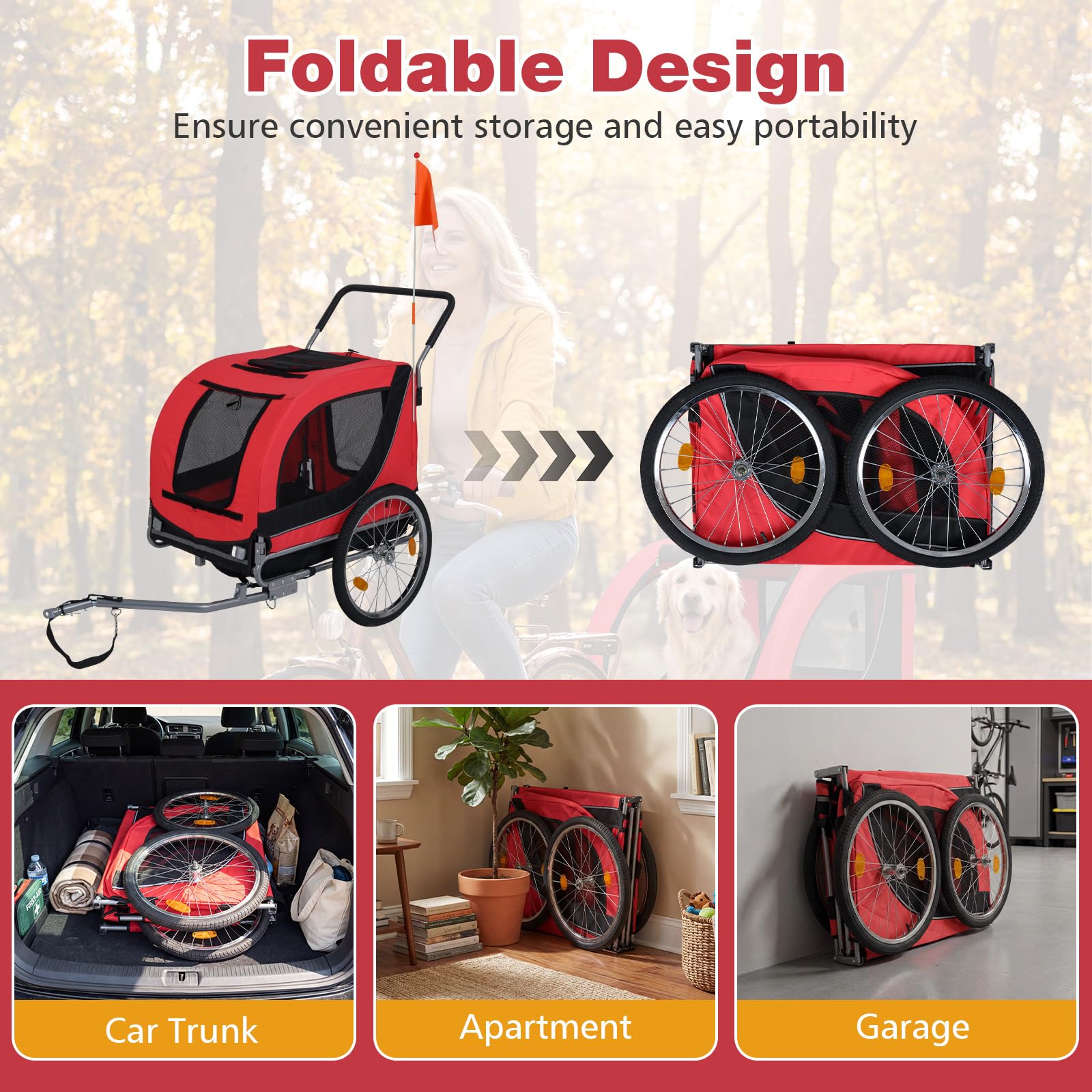 This versatile pet trailer easily converts between a bike trailer and a pet stroller thanks to its removable front wheel and folding tow bar. Breathable mesh windows provide excellent airflow, and zippered doors at both the front and rear allow your dogs to enter and exit freely. The sturdy metal frame and tear-resistant Oxford fabric ensure long-lasting durability, and the smooth-rolling wheels handle a variety of road surfaces with ease. In addition, thoughtful safety details such as reflectors, a safety flag, and an internal restraint leash help enhance visibility and peace of mind on every trip.