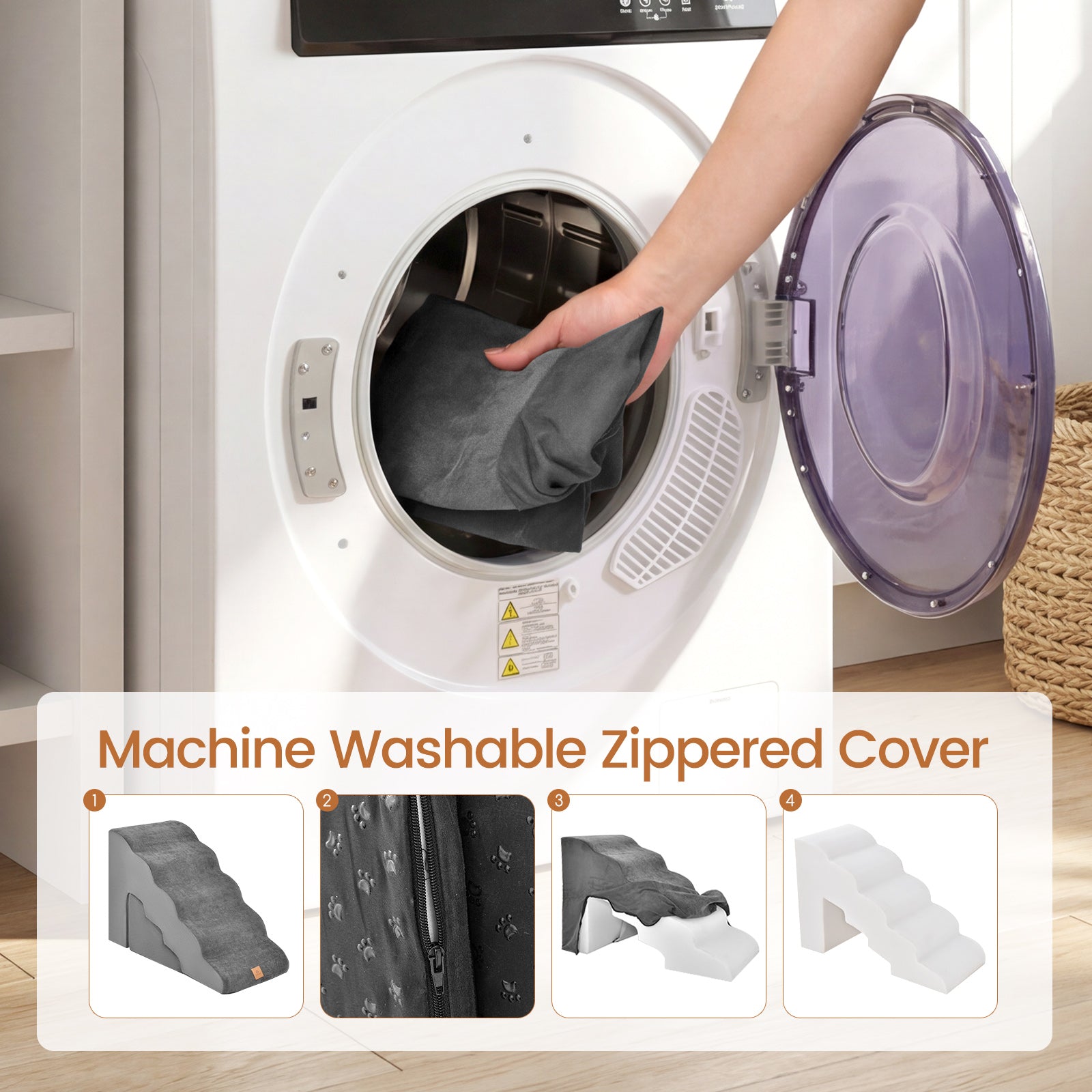 • Easy Cleaning: The pet stairs adopt a detachable and machine-washable cover, which is convenient for deep cleaning. And the package also includes a practical pet hair remover brush, which can effectively capture fluff or pet hair sticking to the surface of the fabric.