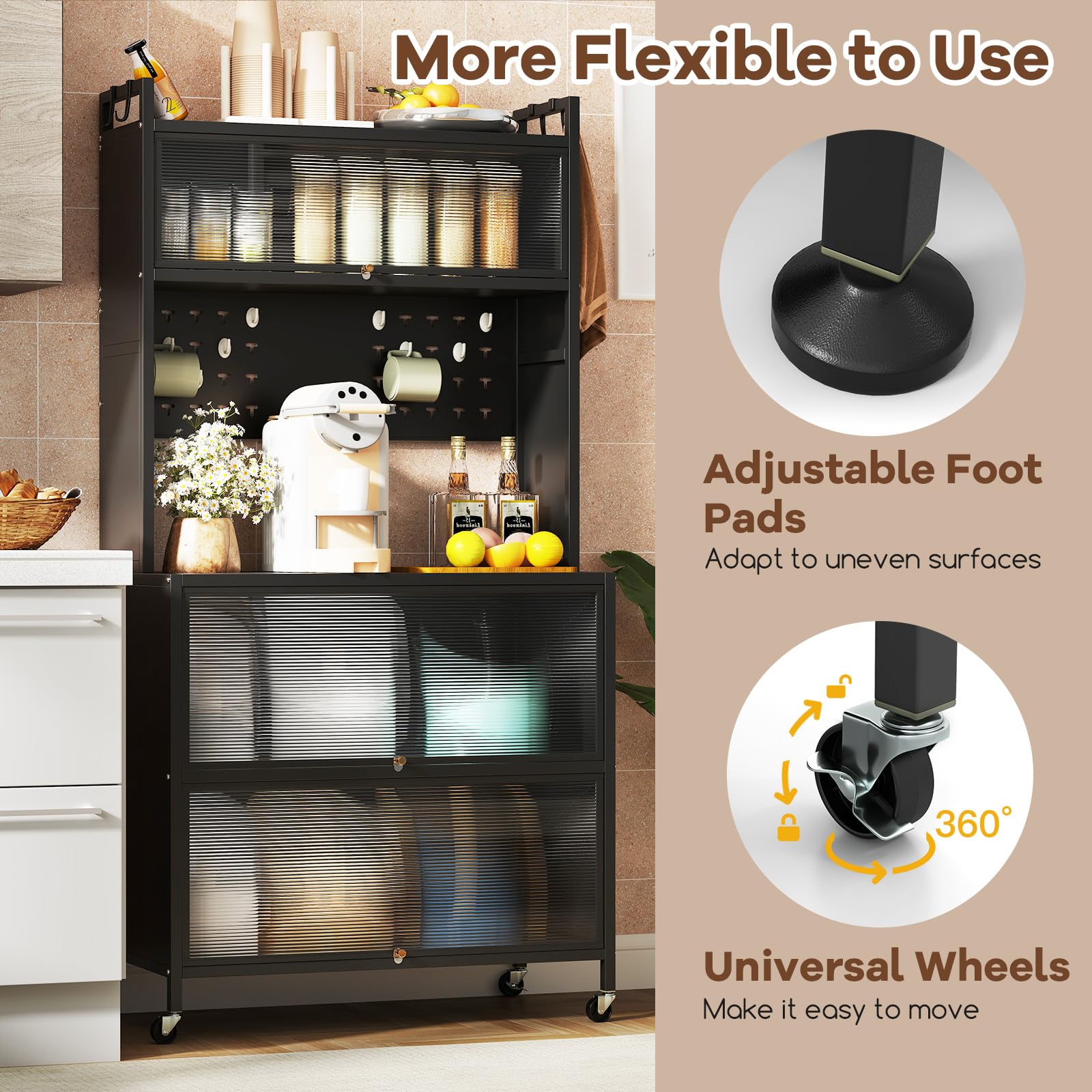 Tidy up your kitchen with our 5-tier kitchen bakers rack! Designed with flexibility, this kitchen storage cabinet allows you to install 4 universal wheels for easy mobility or 4 adjustable foot pads for stability. The translucent flip doors with aluminum alloy knobs offer easy access to items while giving a contemporary aesthetic to create a cozy touch. For security, this 5-tier microwave stand features an anti-toppling device and raised guardrails. The ample storage space keeps your kitchen essentials organized. Additionally, the coffee bar cabinet boasts a multi-layered metal frame for durability. Whether placed in the kitchen, living room or bathroom, this multifunctional storage cabinet is a perfect complement.