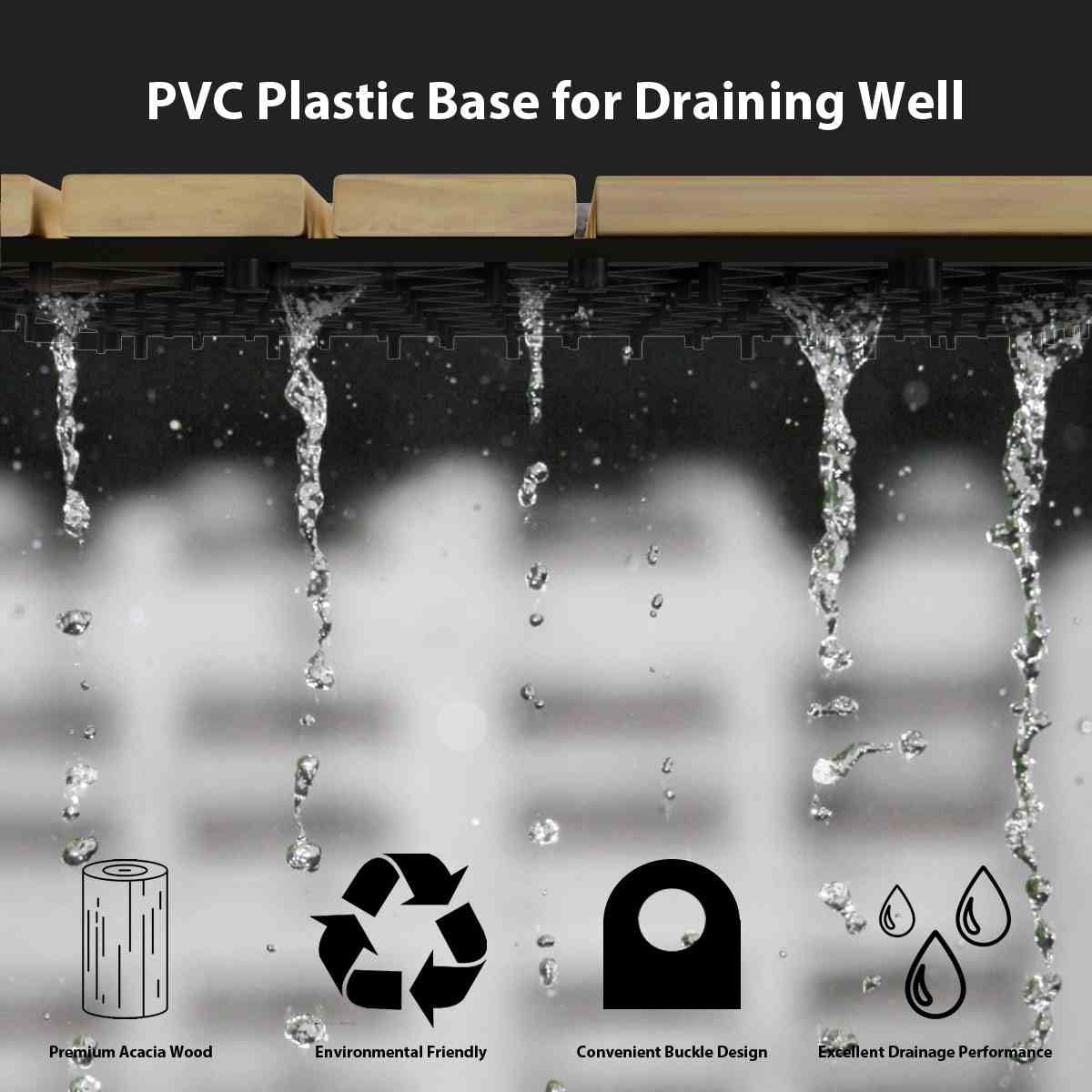 Those tiles are enough to cover 2.5 ㎡. Ft of flooring on your terrace, patio deck, or indoor living spaces. You can pave some tracks or mats out of them. Interlocking mechanisms help you renovate without any hand of tools. You can make some cuts and trim on the tile to fit the figure of your floors. And thanks to the plastic mats, those tiles won’t mess up your old floor. And featuring actual pre-oiled acacia wood logs, it has the real effect of a hardwood floor at a lower cost. Besides, it will last longer on the outside, if you oil those tiles once per 2-3 months.