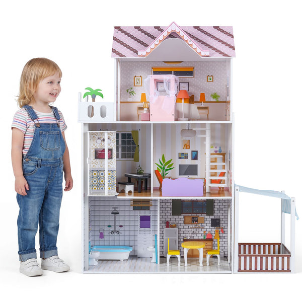 Wooden Dollhouse with 16 Furniture Accessories and Balcony
