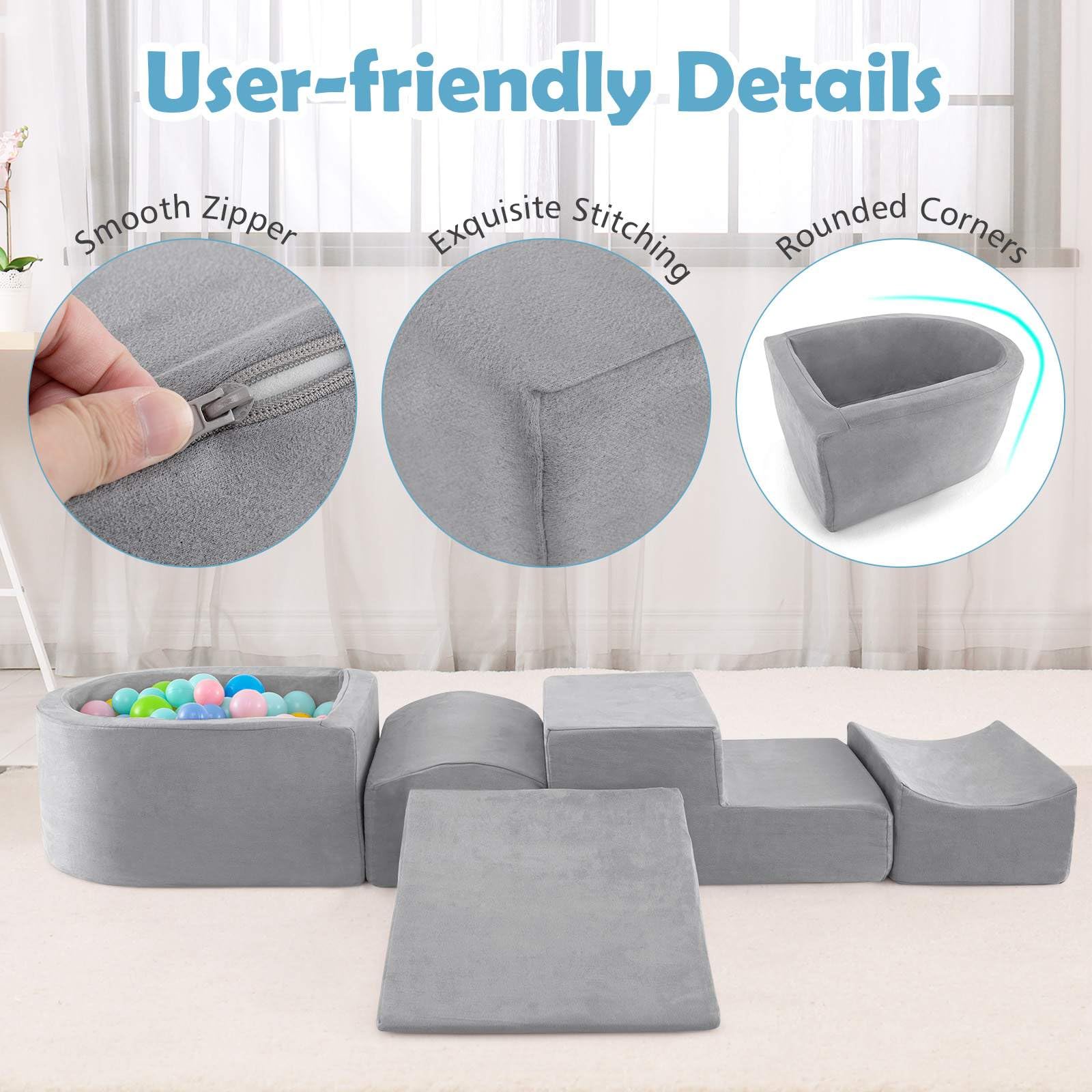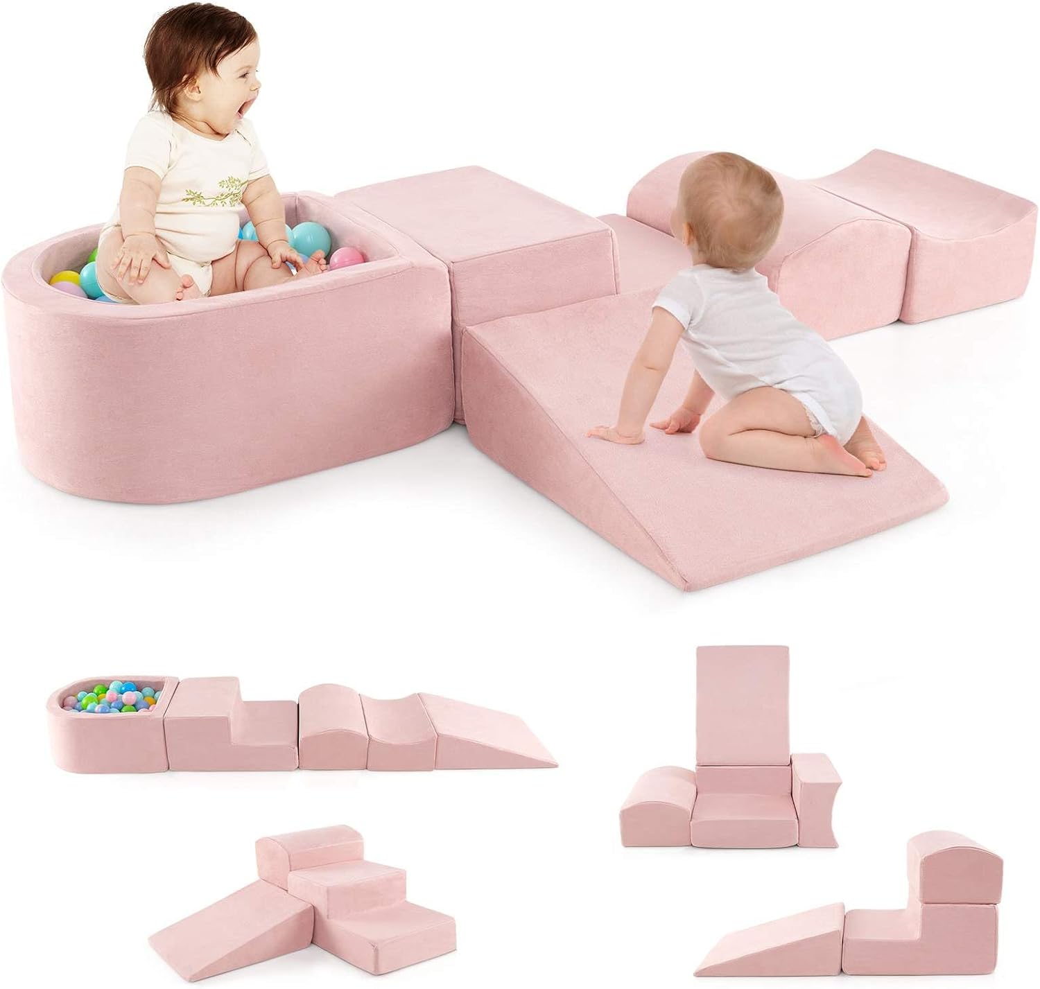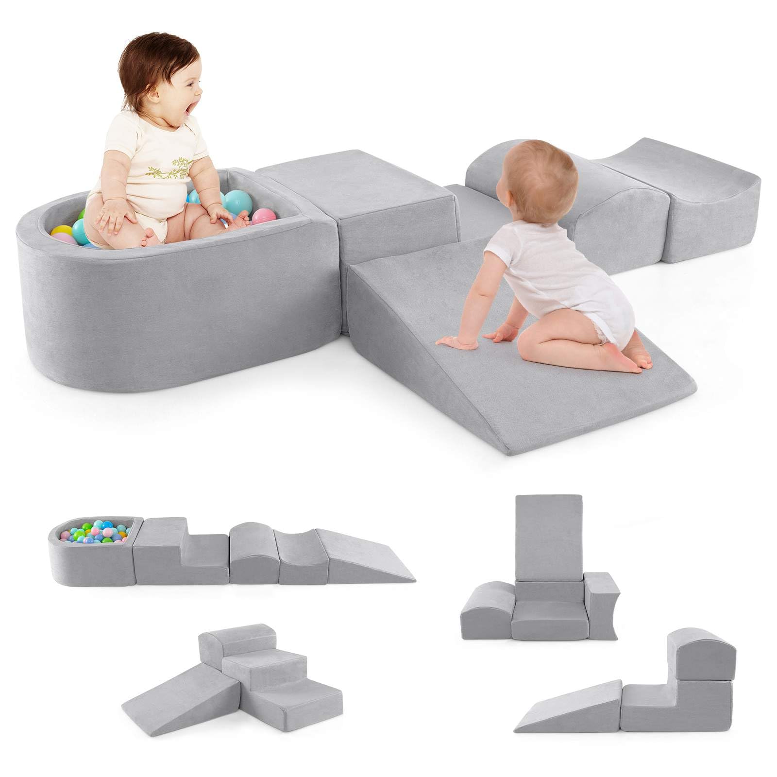 5-Piece Climbing Blocks Set: The soft playset consists of 1 slide, 1 step, 1 half-moon, 1 concave, and 1 ball pit for free DIY combination. Kids can make full use of their imagination to use the blocks to create a variety of shapes. The ball pit also provides kids with unlimited fun. Tips: The ocean balls are not included.