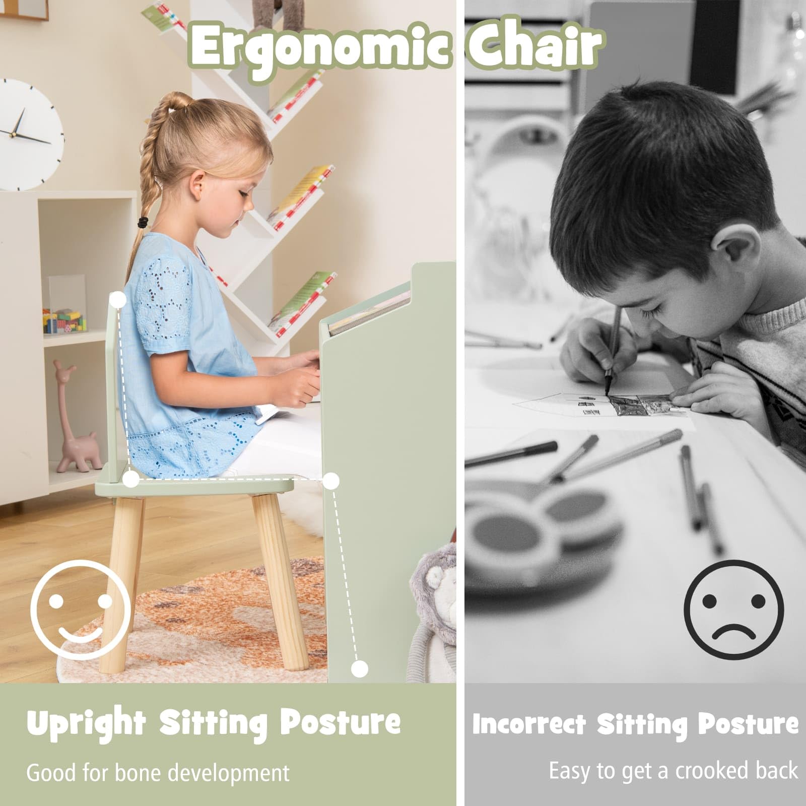 Inclined Chalkboards & Ergonomic Chairs: The chalkboards on the tabletop enable kids to draw and write freely, which is helpful in kids’ painting enlightenment, creativity and imagination stimulation. The chalks can be well stored in the groove. What’s more, the slanted tabletop and chair with ergonomic backrest help to develop a good sitting posture for reading and painting.