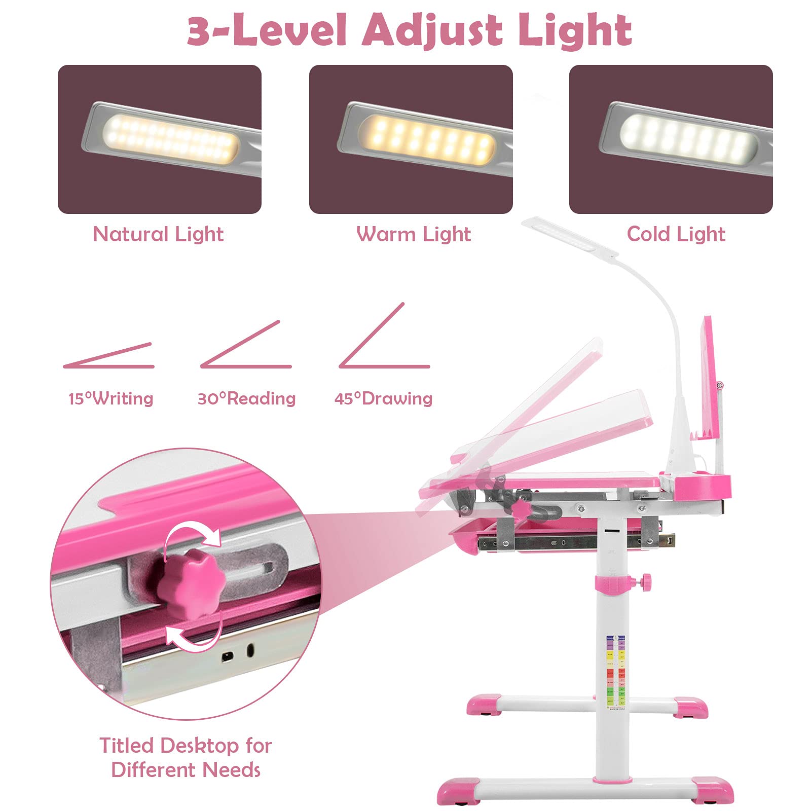 LED Light and Book Stand: The desk is equipped with a detachable LED light, which can be freely adjusted or rotated. More, it offers three different modes--warm light, cold light and natural light. Kids can adjust the brightness to protect vision. Plus, the rotatable book stand helps to fix the book, also with the optimal and proper distance for kids.