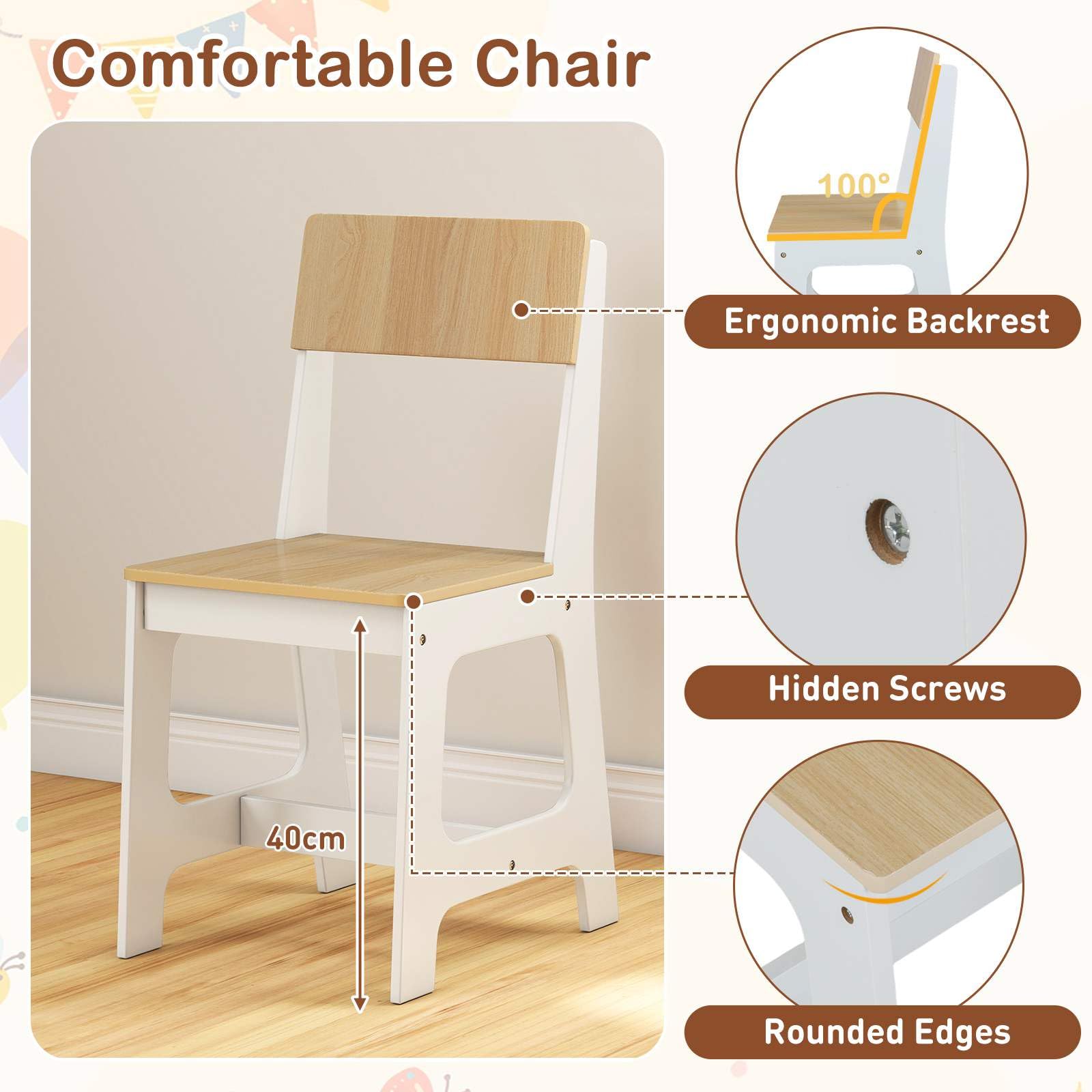 This children writing table offers ample storage options like a top shelf, 2 open compartments, a large drawer, and a storage cabinet for organization. The study desk features a convenient built-in cork bulletin board for personalization and creativity. The included chair with an ergonomic backrest ensures comfort during study sessions. This versatile set is perfect for studying, reading, drawing, and playing, making it an ideal gift option compliant with ASTM and CPSIA.
