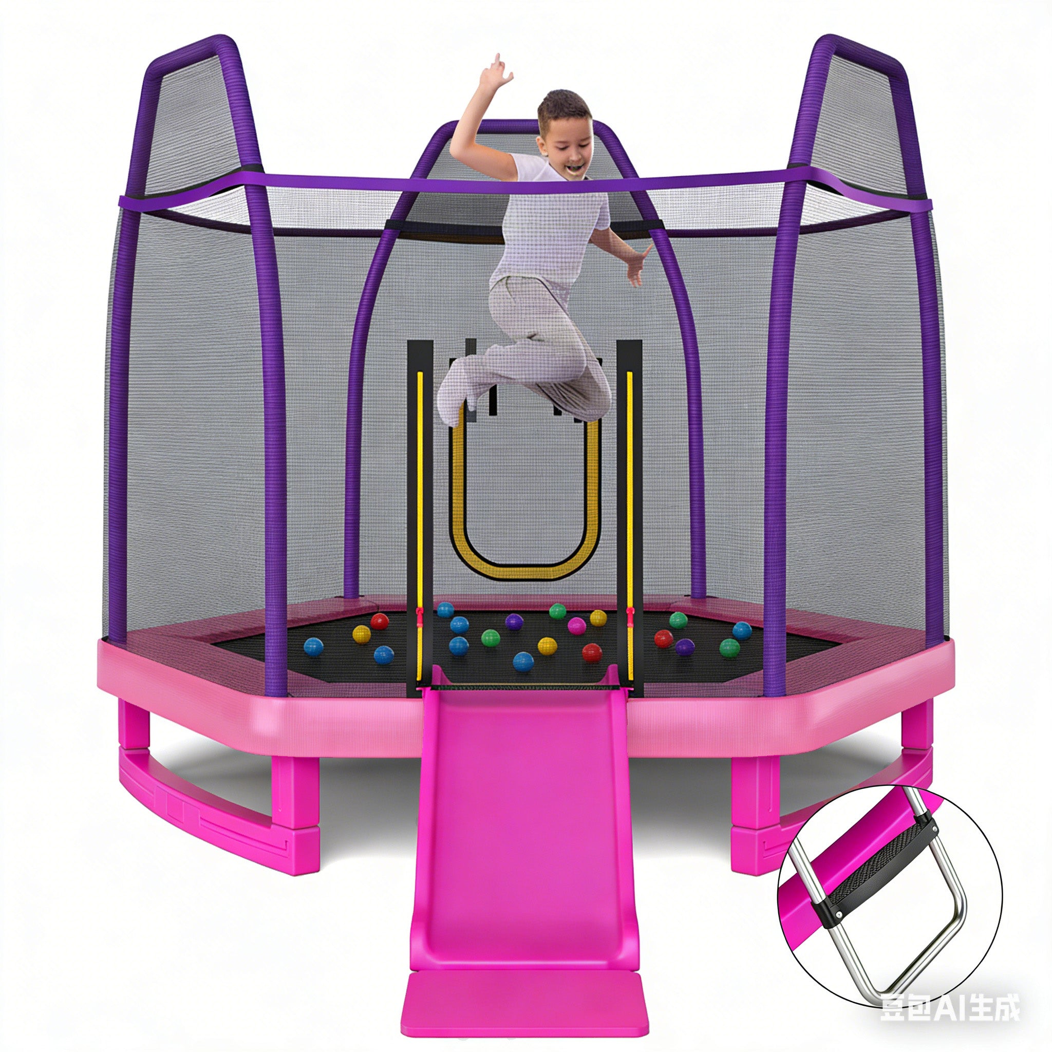 - šć3 in 1 Designć This 7 ft kids trampoline is comprised of a trampoline, slide and ladder. And 20 colorful ocean balls are included. Thus, the toddler trampoline creates a place for kids to jump, slide and climb, during which they can experience the fun of various games.