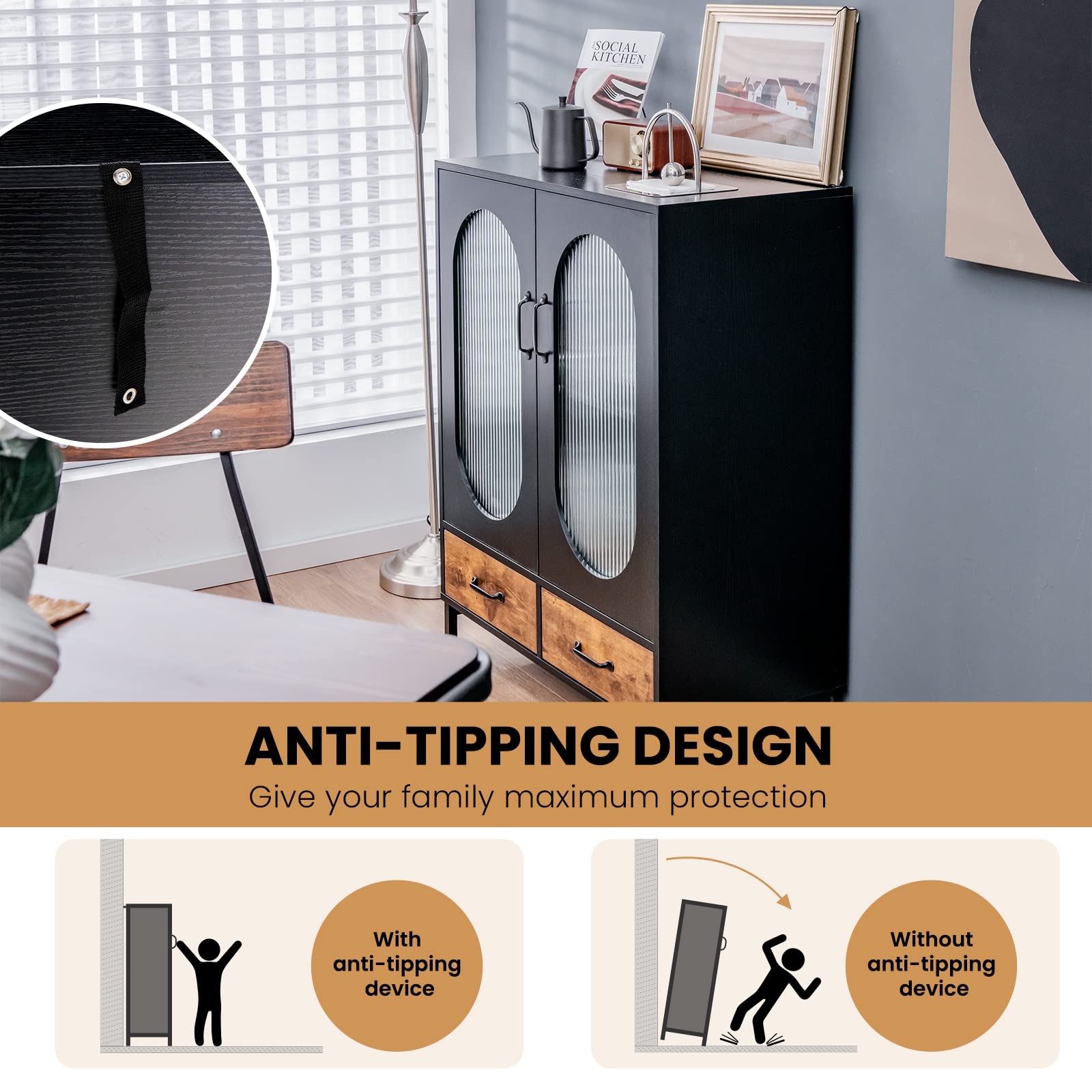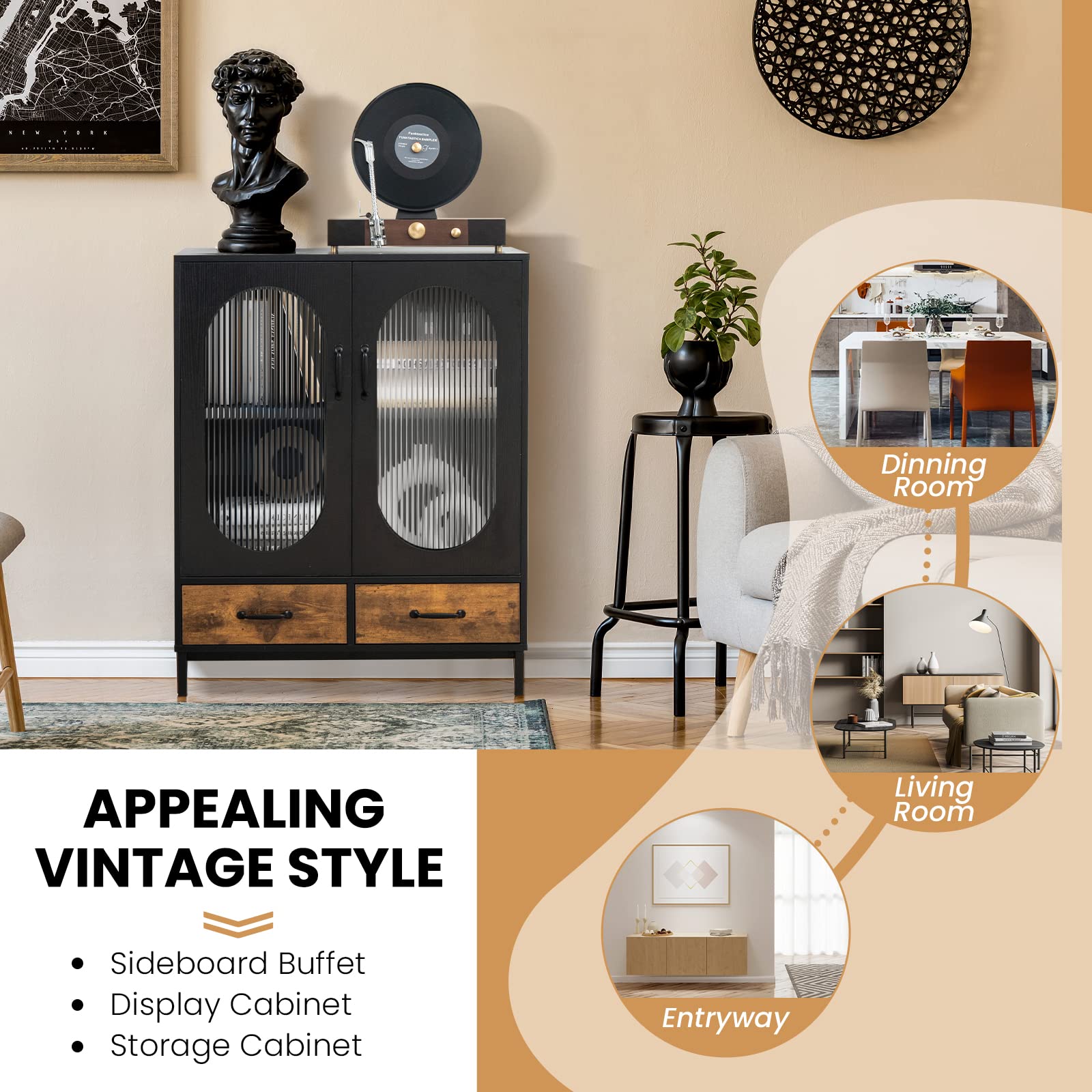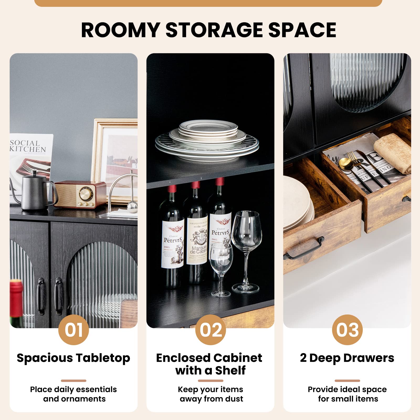 Do you need a practical & chic storage cabinet to keep your dining room well-organized? Look our industrial buffet sideboard! It has a 2-tier storage cabinet and 2 deep drawers that can sort and hide a variety of sundries. Besides, the spacious countertop is ideal for displaying your favorite ornaments, photo frames and vases. Thus, the cabinet can be used as a buffet sideboard, display cabinet, storage cabinet according to your different needs. The industrial appearance and corrugated tempered glass doors make it stylish and eye-catching. Besides, durable and rustproof steel frame ensures long-lasting service life. The strong load capacity and anti-topping device allow you to store items with confidence. Furthermore, waterproof surface and 10.5cm ground clearance make cleaning a breeze for you.