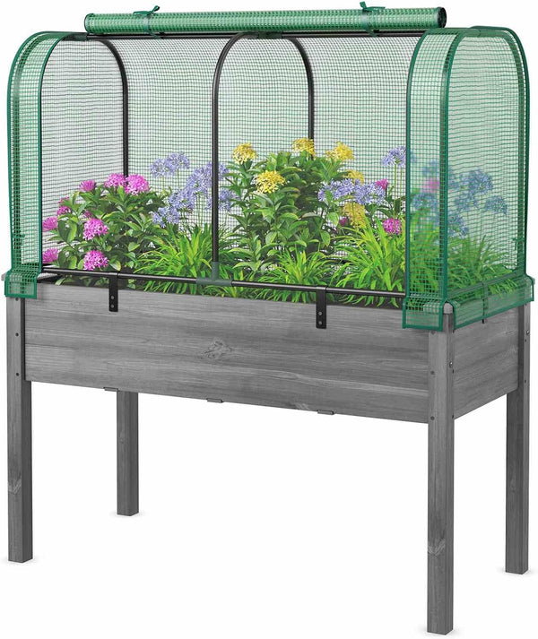 Wooden Raised Garden Bed w/ Sun-Protective PE Cover Elevated Planter Box w/ Legs