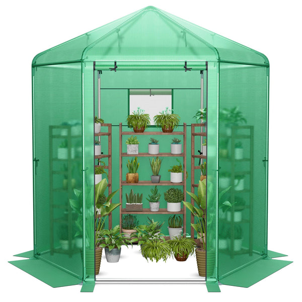 Walk-in Greenhouse, Hexagonal Greenhouse with PE Cover & Metal Frame, Winter Greenhouse with 2-Layered Window & Roll-Up Door