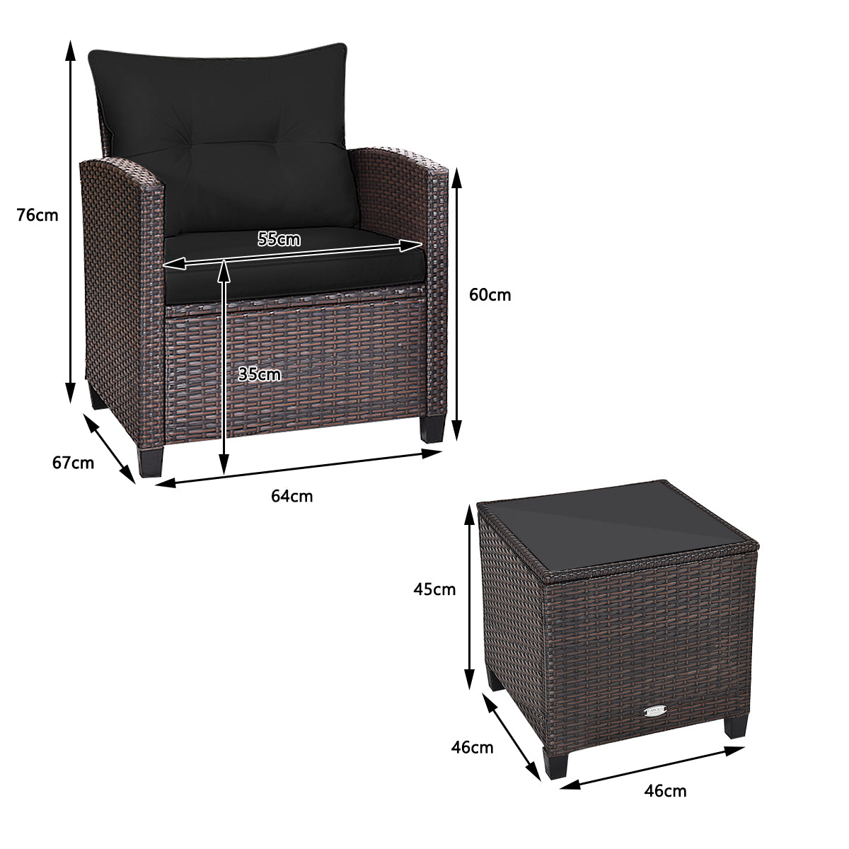 Do you want to drink coffee or have a break with your friend in your outdoor space? Our 3-piece outdoor rattan furniture set is great for you. It can be used as a cozy corner in garden, backyard, porch, pool and cafe shop both for indoor or outdoor space. Made of sturdy steel and high quality rattan, the sofa set is sturdy and durable which can be used for long time. Comes with a tempered glass top table, not only can you place some drinks or snacks on hard tabletop to take conveniently but also some decors like vase can be put on the tabletop. The sofas are equipped with back and seat cushion which will give you excellent comfort. And the cover of seat cushion has zipper for removing and rinsing easily. It's perfect to relax and enjoy time with your friends and family.