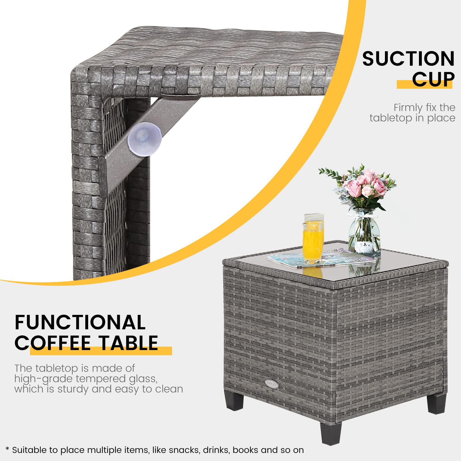 Functional Side Table: The side table provides sufficient space for you to place multiple items, like snacks, drinks, books and so on. The tabletop is made of high-grade tempered glass, which is sturdy and resistant to scratches. Moreover, the suction cups firmly fix the tabletop in place.