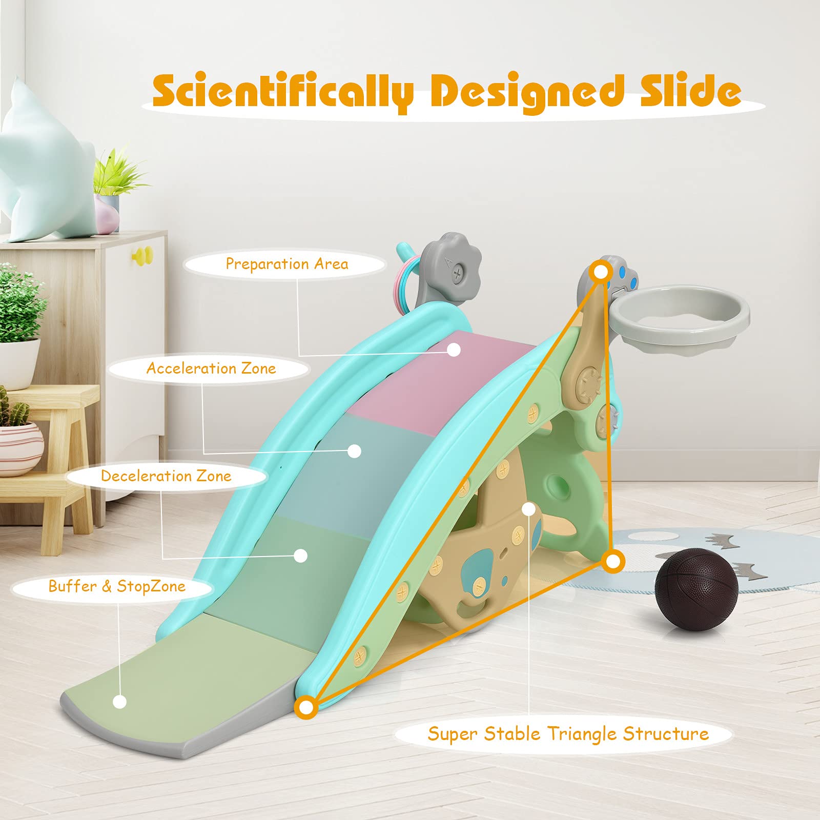 4-in-1 design with the game of sliding, swinging, basketball and ring-toss