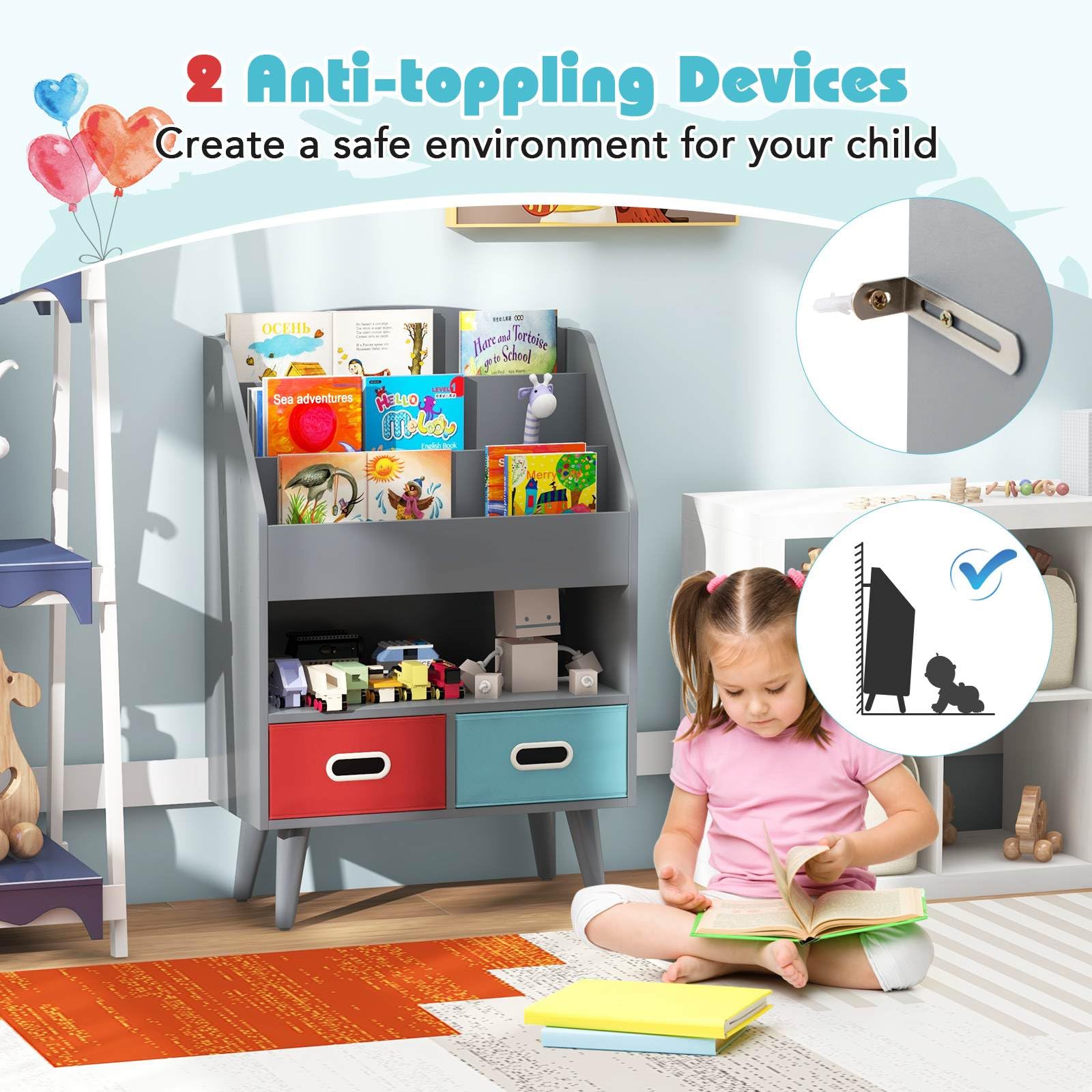 Kids' Safety Is Emphasized: Designed with kids' safety in mind, this bookcase toy organizer features rounded corners and a splinter-free surface. It also comes with dual anti-toppling devices to securely anchor the bookrack to the wall, meets ASTM and CPSIA standards and gives parents peace of mind.