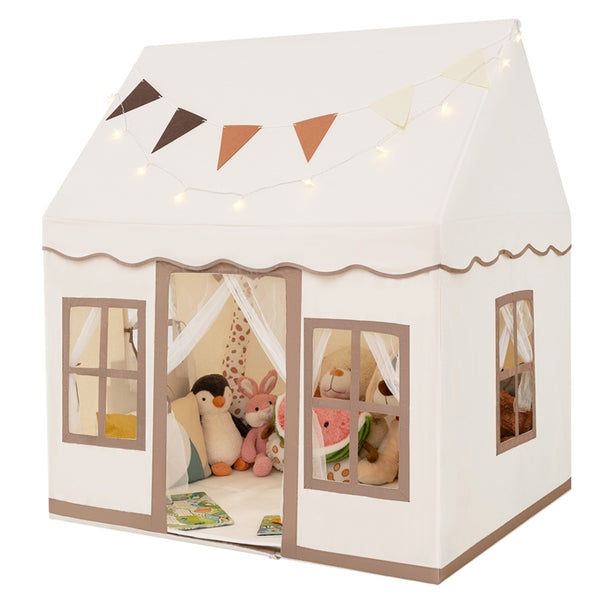Kids Play Tent, Large Playhouse w/Star String Lights & Flag Banner, Washable Anti-Slip Coral Velvet Mat