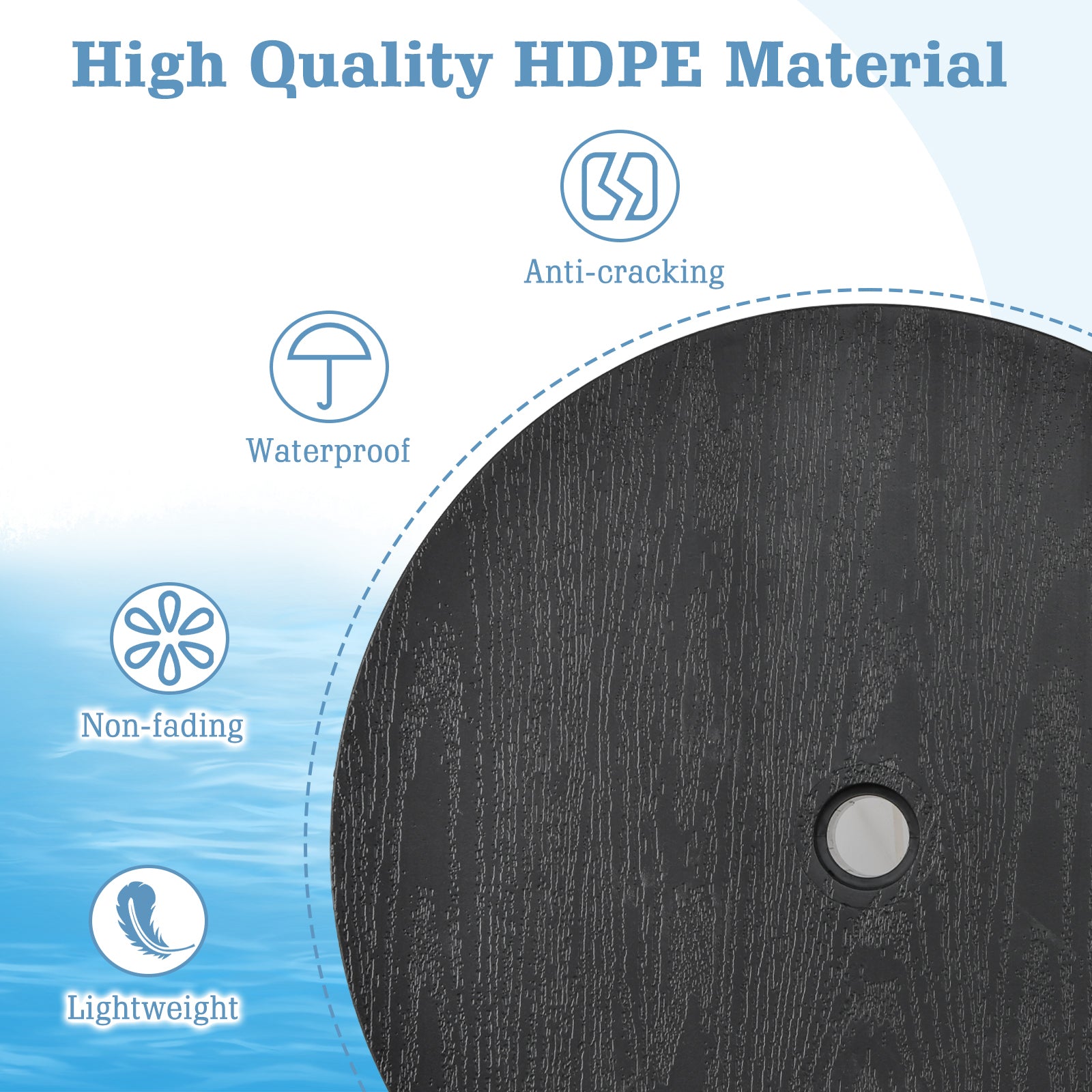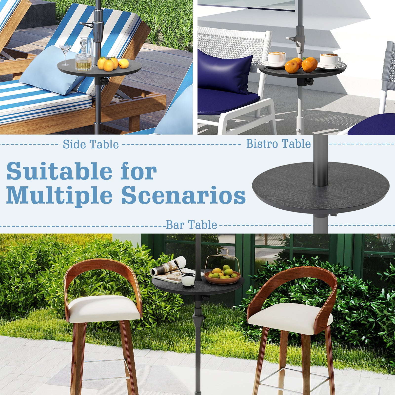 Our umbrella table tray is equipped with a hole in 40 mm diameter, which can match most of the patio umbrellas for shading. The round umbrella table top is made of premium PE to ensure excellent resistance to wear and water for durability. Thanks to the robust material, the umbrella table can be used all year round for outdoor events in patio, garden, poolside, backyard, etc. Besides, the patio adjustable umbrella pole features diamond-shape design on the bottom to ensure even force distribution. Meanwhile, the umbrella table tray is very lightweight to carry to wherever and very easy-to-maintain with a cloth only! And the portable umbrella table tray is simple to set up without any tools required, so you can start using your table in no time and focus on relaxing outdoors.