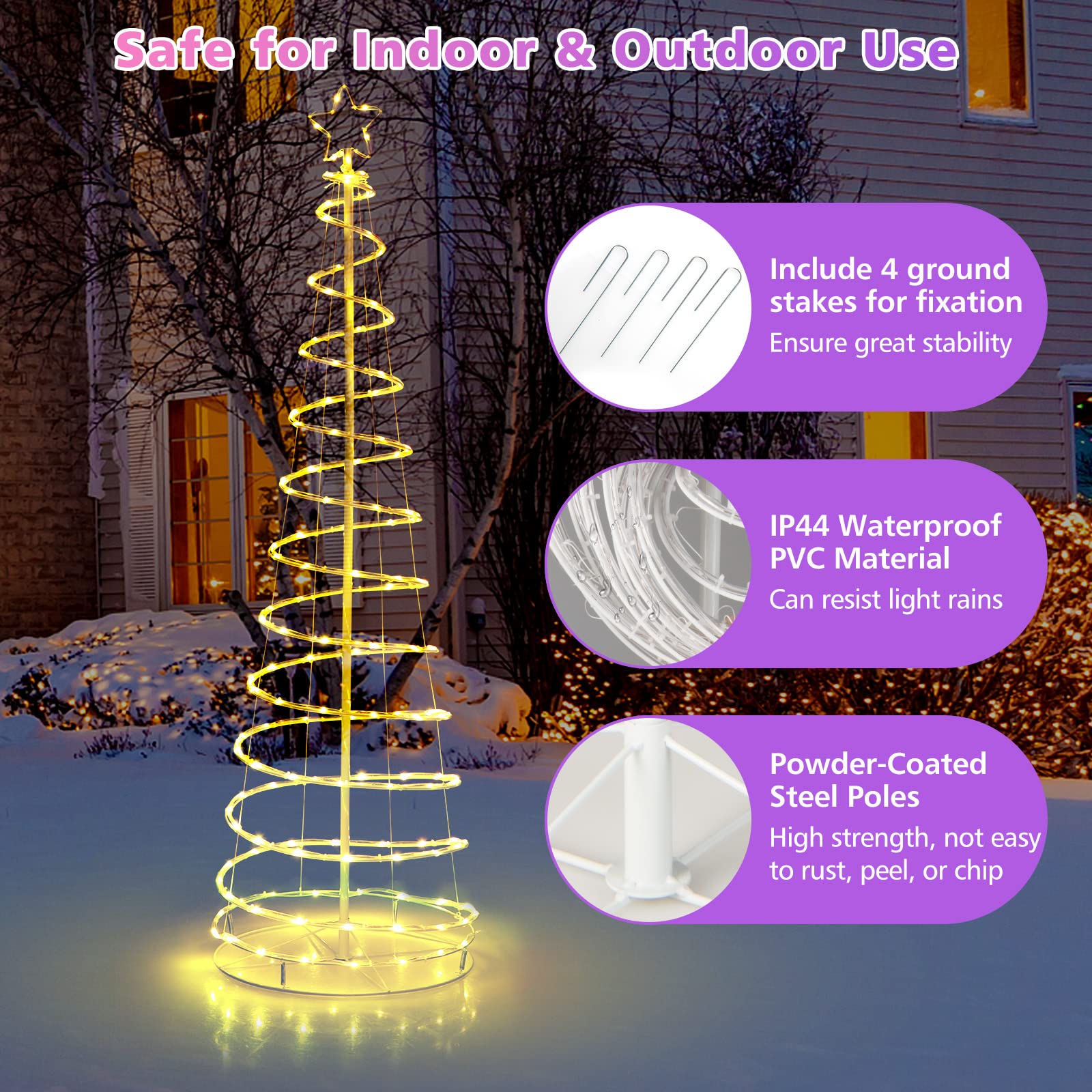 Safe for Indoor & Outdoor Use: The coil is made of premium IP44 waterproof PVC material that can resist light rains and snow, allowing for indoor and outdoor use. Besides, the collapsible Xmas tree is supported by a high-strength powder-coated steel frame, ensuring great sturdiness. The package also includes 4 ground stakes for fixing the tree to the ground to resist wind.