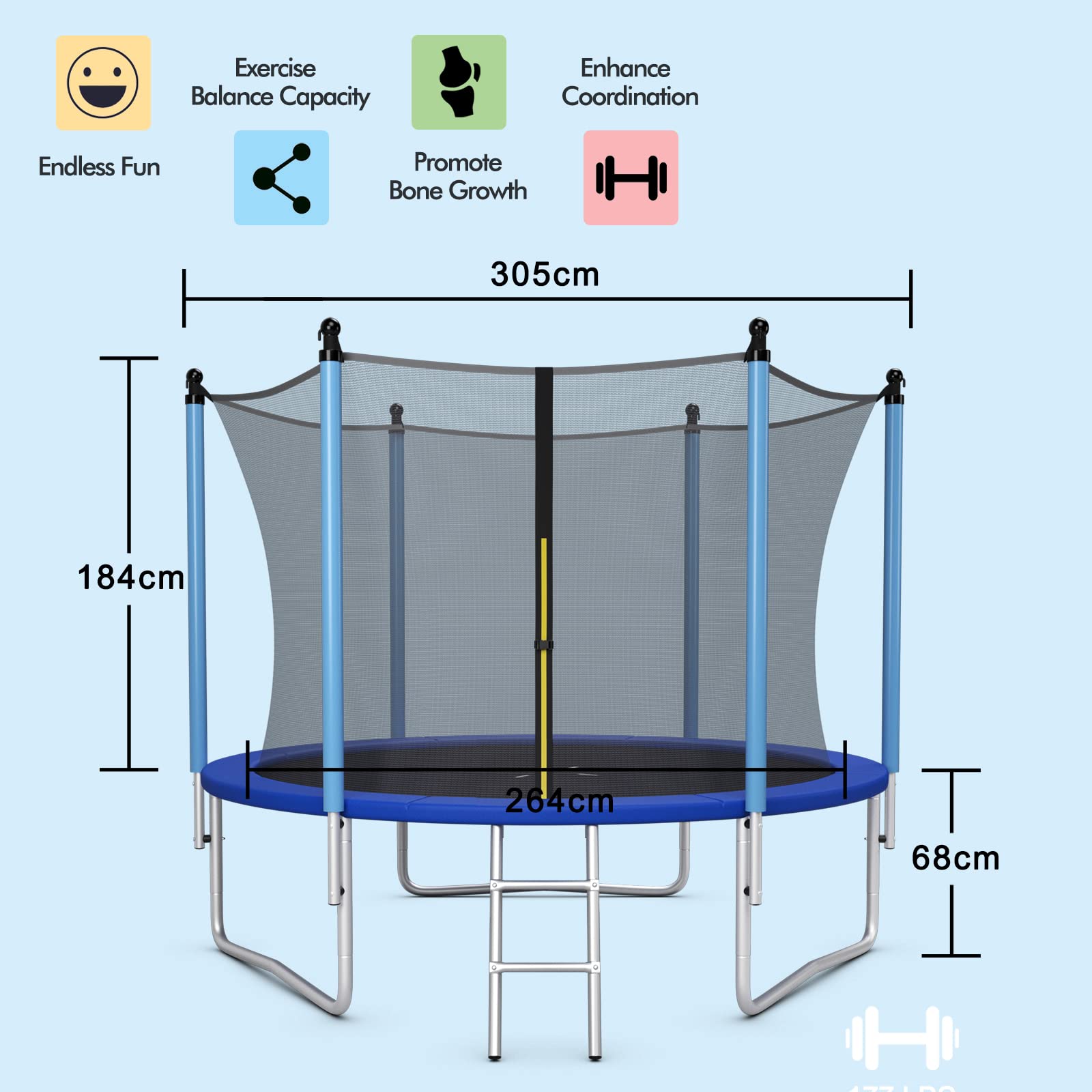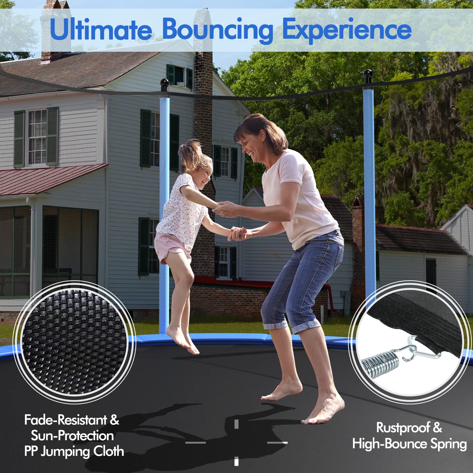 The 10/12/14 FT outdoor trampoline comes with heavy-duty steel pipes, protective foam sleeves, and 3/4 U-shaped foot tubes providing strong strength and stability. What's more, the trampolines are rust-resistant and ultraviolet-resistant which allows you to enjoy outdoor jumping. And it is equipped with a high-resilient and wear-resistant jumping mat for providing excellent bounce, a tightly woven enclosure net to keep fingers and toes from getting caught, and long rust-resistant steel springs for safety. Other than that, the backyard trampoline comes with a ladder, dual zipper, and buckle-up closure system for kids to climb in and out easily. All in all, the trampoline is not only great for family activities to promote the relationship but also good for getting your blood pumping and your muscles moving, which will definitely be the best gift for your family!