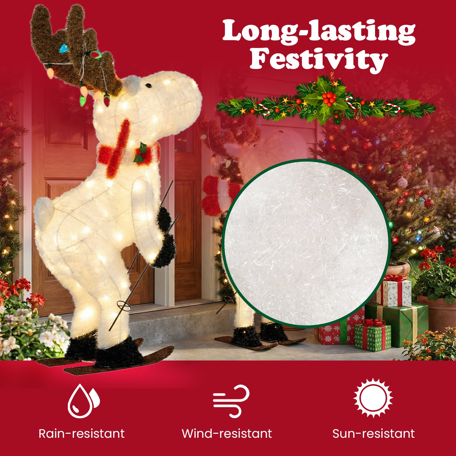 Long-lasting Festivity: Crafted for outdoor use, this skiing deer decoration is built to withstand the changing weather during the holiday season. In addition, the sun-resistant fabric keeps your reindeer shining bright and festive, year after year.