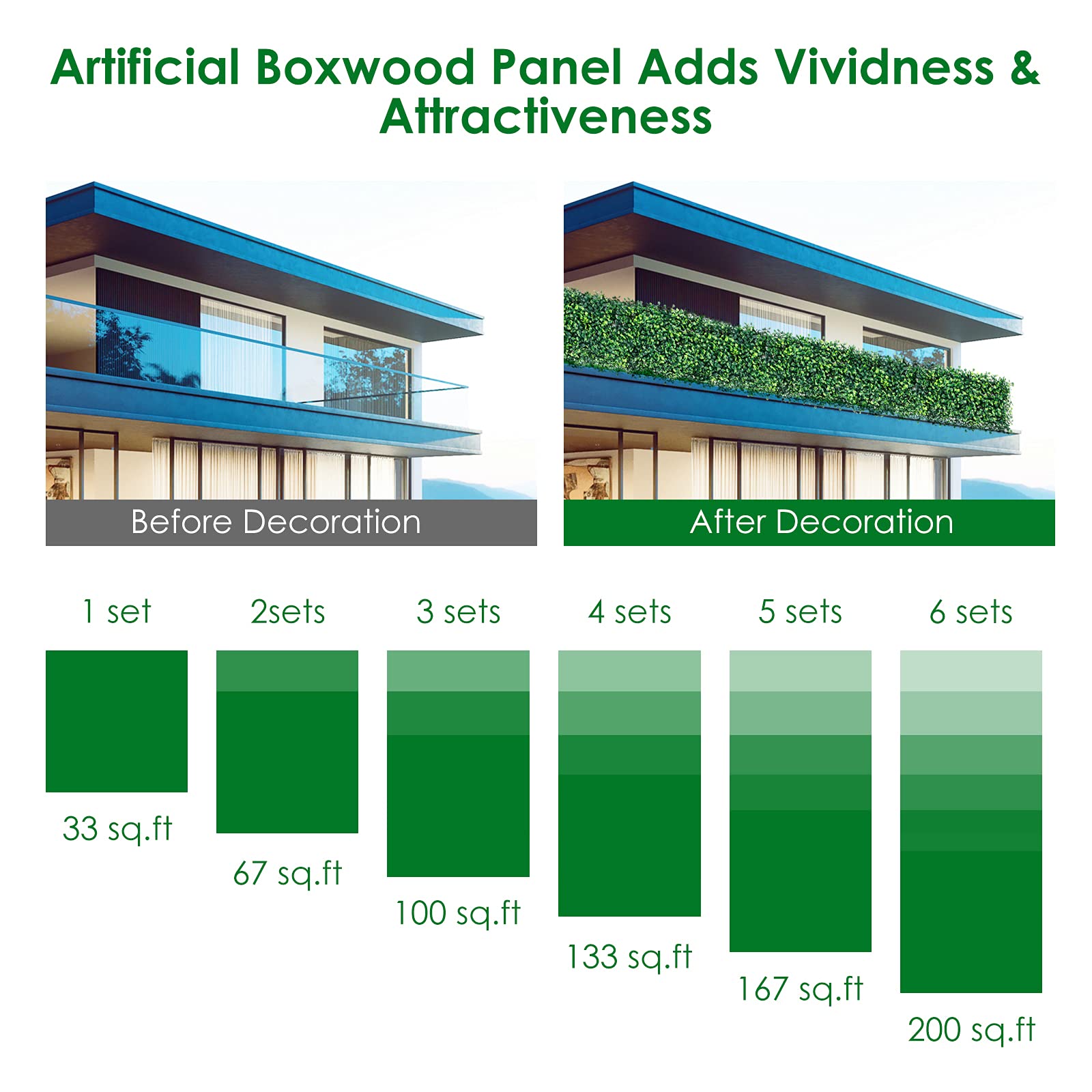 Different Quantity & Covering Size: There are 12 artificial boxwoodpanels in one package and each of them measures 50 x50cm, providing a cover area of 3 square meters. Also, you can design a unique shape by changing the assembling numbers of the panels.