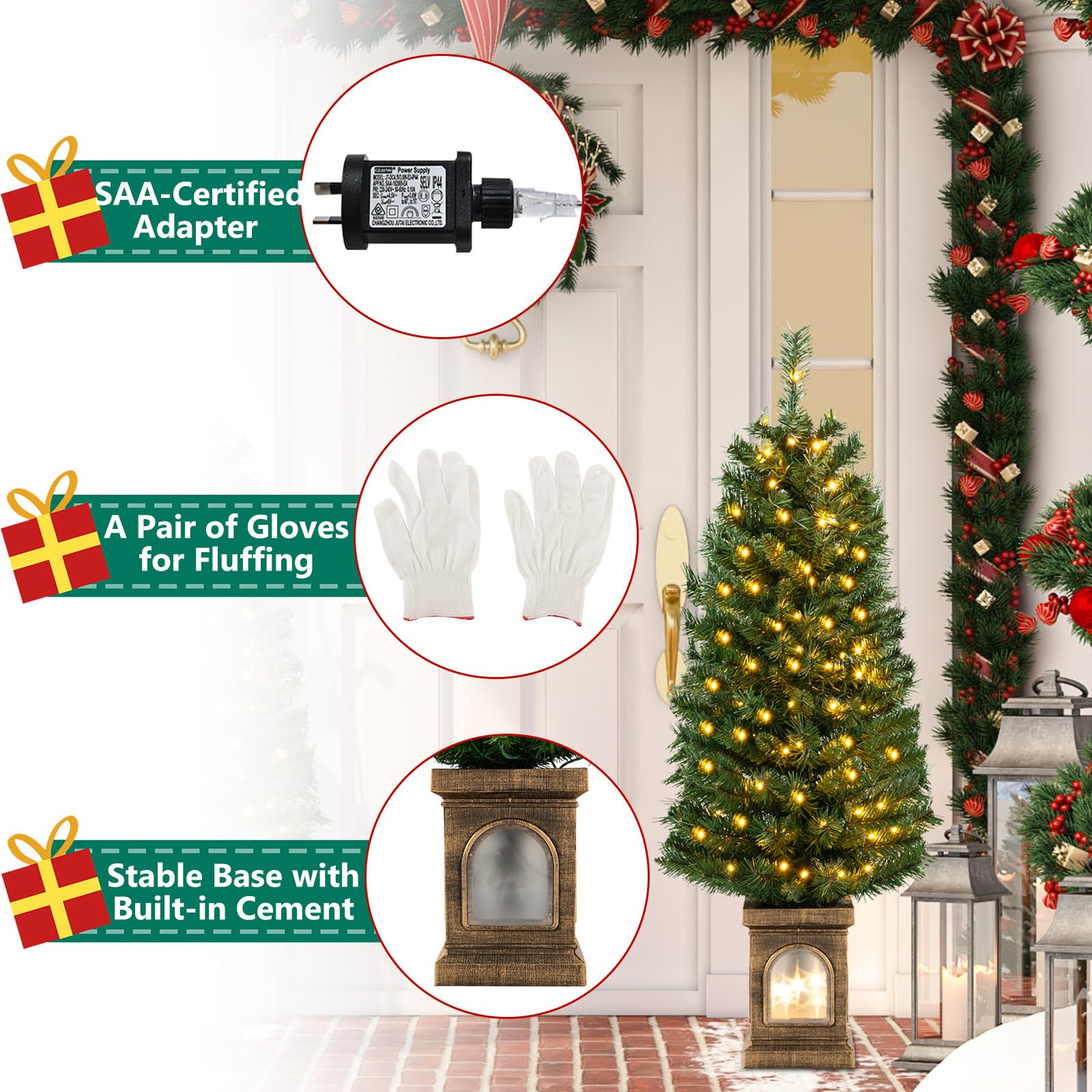 Stable Structure & Easy Assembly: The entrance artificial Christmas tree is equipped with a stable base that is filled with cement, providing added stability and preventing tipping or wobbling. Besides, the Xmas tree requires no installation and all you need to do is to fluff the branch tips to get a fuller shape. And we also provide a pair of gloves for protecting your hands.