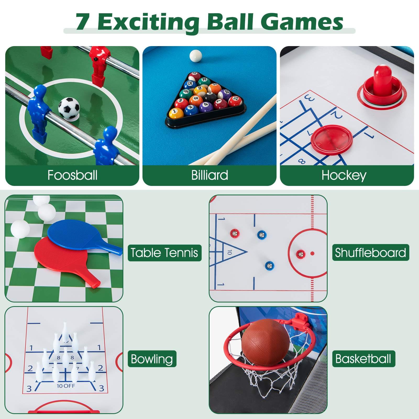 Look no further than our 14 in 1 Game Table Set! With 7 thrilling ball games - including foosball, hockey, billiards, table tennis, bowling, shuffleboard, and basketball - and 5 board games and 2 toss games like chess, backgammon, checkers, poker & dice, ring toss, horseshoes, and tic tac toe, this game table set has it all! Maximize space with our thoughtful stackable design. When not in use, simply stack all the tabletops together, making it seamless to switch between game surfaces and providing easy, clutter-free storage. Why wait? Elevate your game nights and create unforgettable memories with our 14 in 1 Game Table Set. It's the perfect choice for those seeking variety, durability, and endless entertainment.