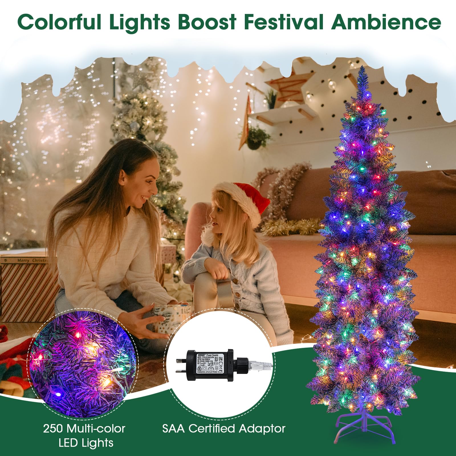 Colorful lights Boost Festival Vibe: Pre-strung with 190/250 multi-color LED lights, the Christmas tree will add a touch of enchantment to everywhere. When lit, the xmas tree will emit bright lights, creating a magical ambiance that will captivate your guests. And the lights are safe to use.