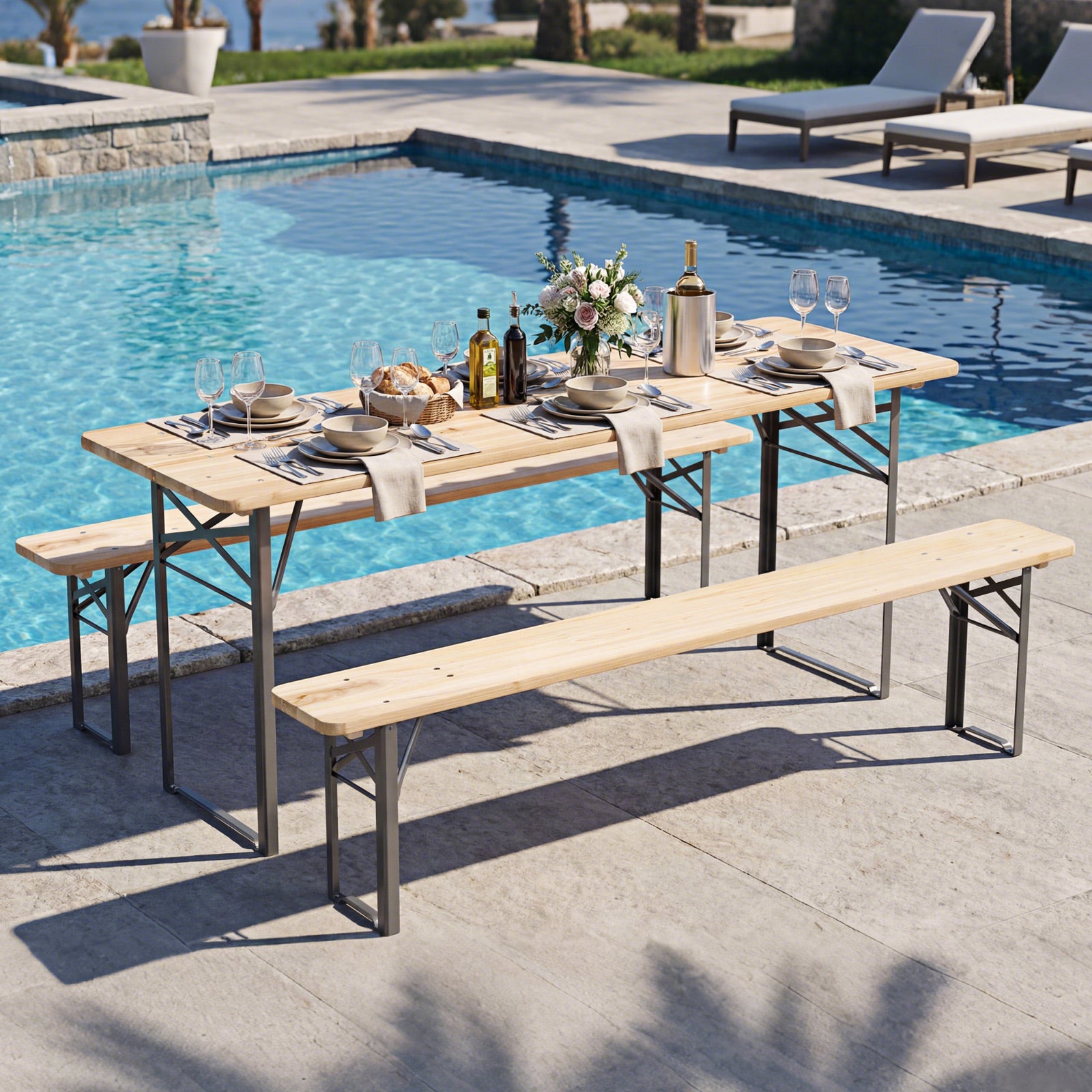 177 CM Folding Picnic Table with 2 Benches 3-Piece Solid Fir Wood Camping Beer Table Bench Set