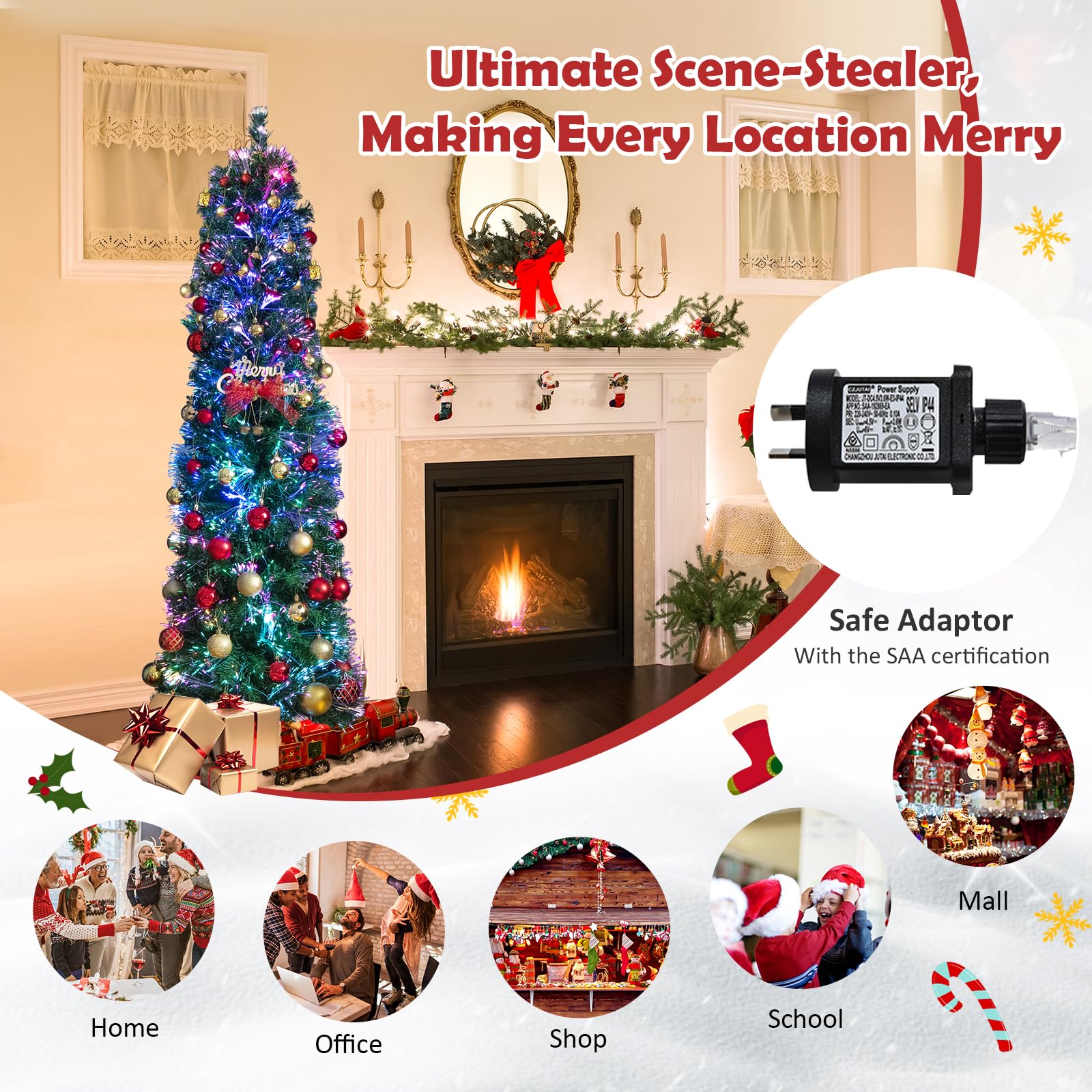 Thanks to 697 evergreen branch tips, the Christmas tree looks realistic. Also, it comes with colorful fiber optics that offer a charming lighting show. By the way, the SAA certificated adaptor is included for higher security. Since the artificial tree is made of premium PVC, it is fireproof, non-allergic & has no weird smells. For small rooms, the Xmas tree is a perfect choice, since its slim pencil shape can fit into any corner. Finally, the Christmas tree is easy to assemble & its folding metal stand will maintain perfect stability.