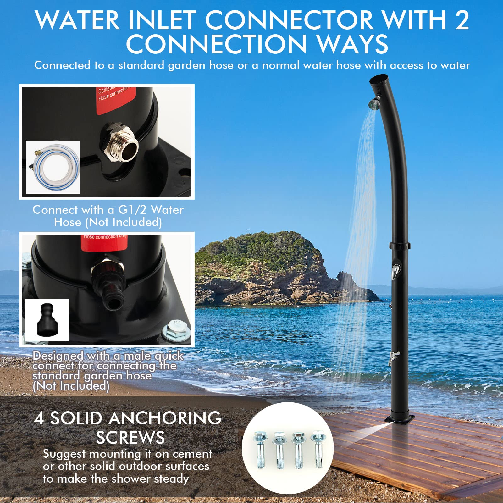 Easy to Set up & Inlet Water: The freestanding shower is equipped with 4 anchoring screws for fixation, and we suggest mounting it on cement or other solid outdoor surfaces to make the shower steady. In addition, with a water inlet connector and an 8/10 cm male quick connector, it is easy to connect to a 2.5/5 cm water hose or a standard hose.