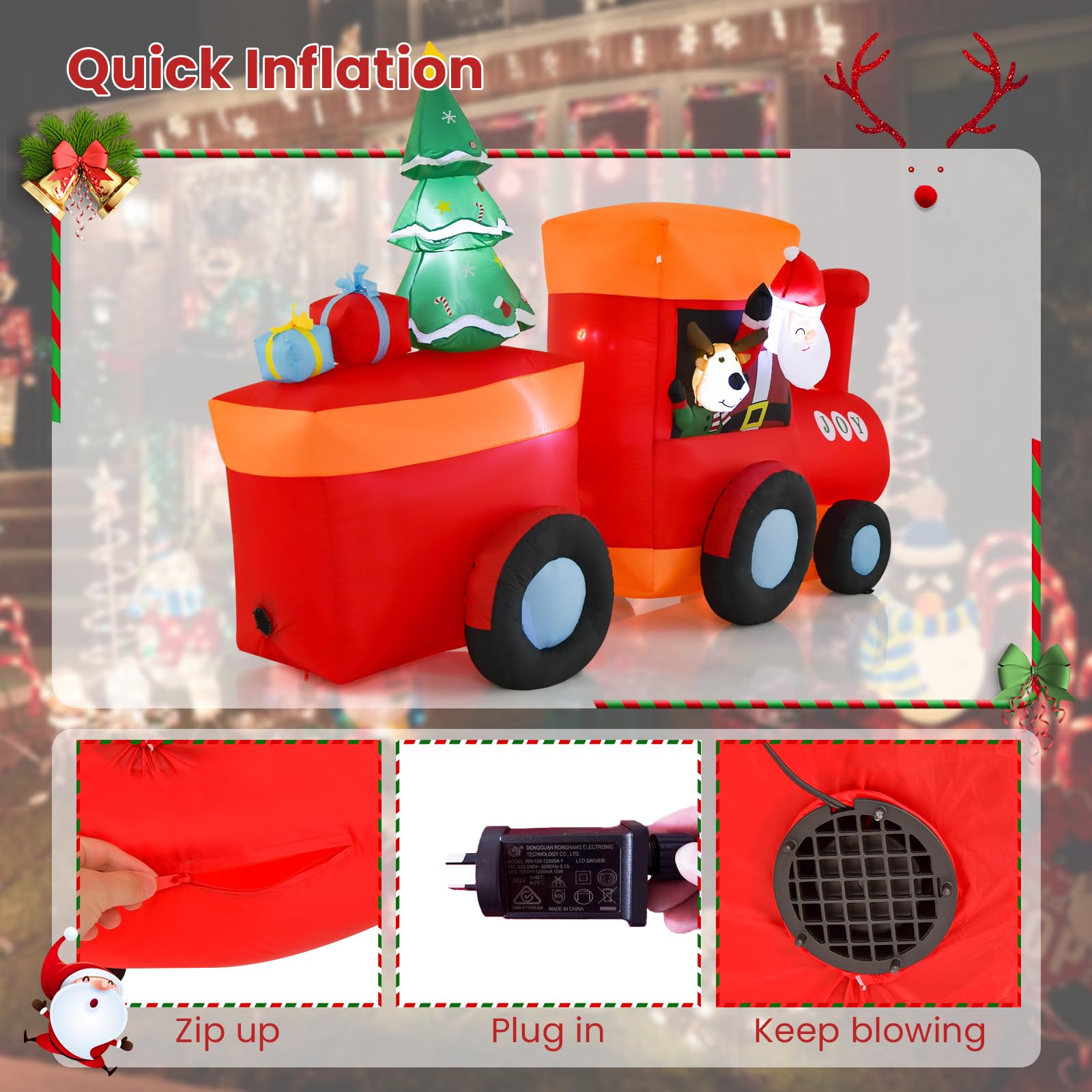 Lighted Christmas Train: The 6 bright LED lights in the inflatable train will look great during the day and incredible at night, making your yard more eye-catching. Your yard will be noticed this Christmas with this unique inflatable. The train features elements of a Christmas tree, Santa & deer, and gift boxes for a strong festival atmosphere.